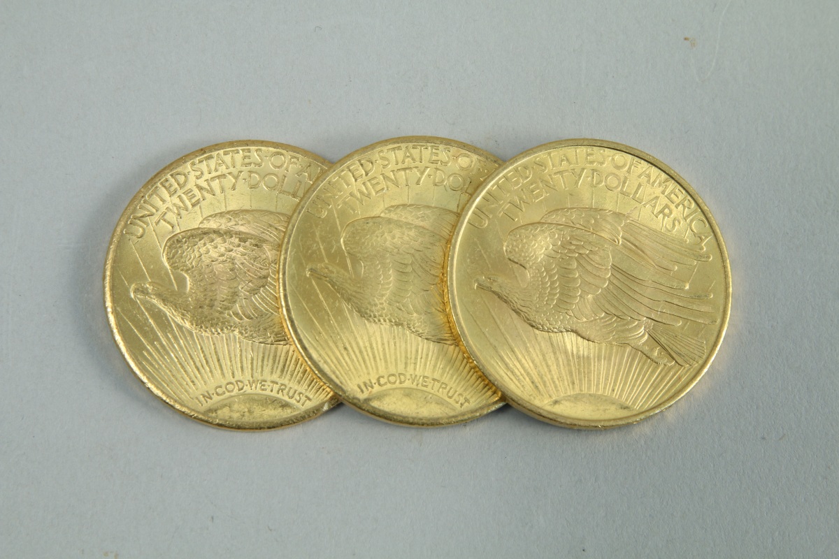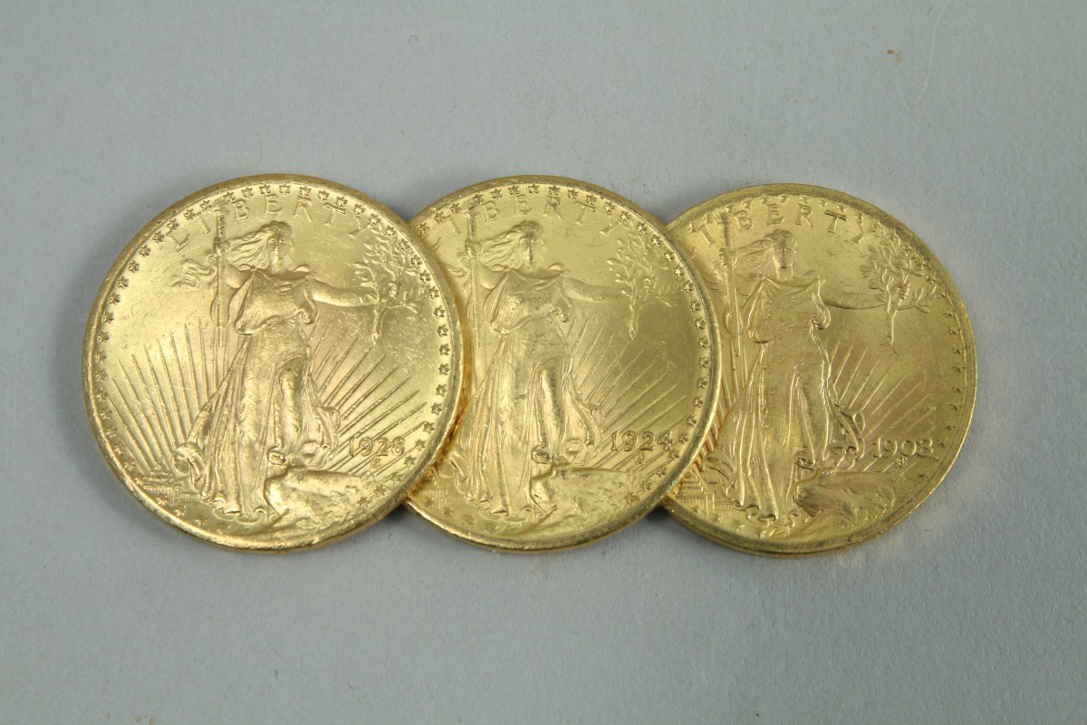 ETATS-UNIS. 3 pièces de 20 DOLLARS or. 1908, 1924, 1928.