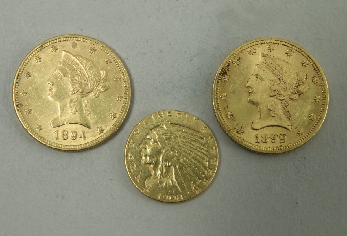 ETATS-UNIS. 3 pièces or: 2 pièces de 10 DOLLARS, 1884 et 1899 - et 1 pièce de 5 DOLLARS, 1908.