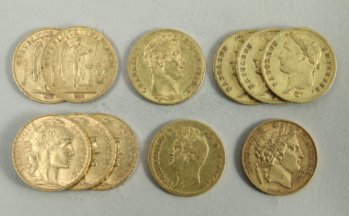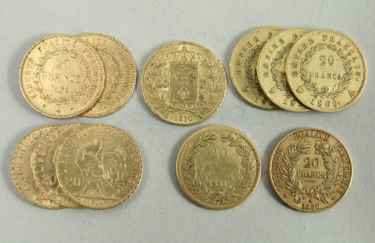 FRANCE. 20 FRANCS or, 11 pièces: 3 Napoléon Ier lauré 1809, 1811, 1813. 1 Charles X 1830. 1 Louis-Philippe 1831. 1 République 1850. 2 Génie 1875, 1876. 3 Coq 1904, 1905, 1909,.
