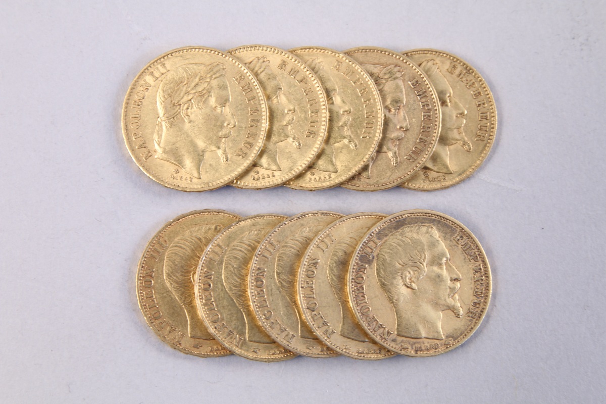 FRANCE. 20 FRANCS or, 10 pièces Napoléon III: 5 lauré, 5 tête nue.
