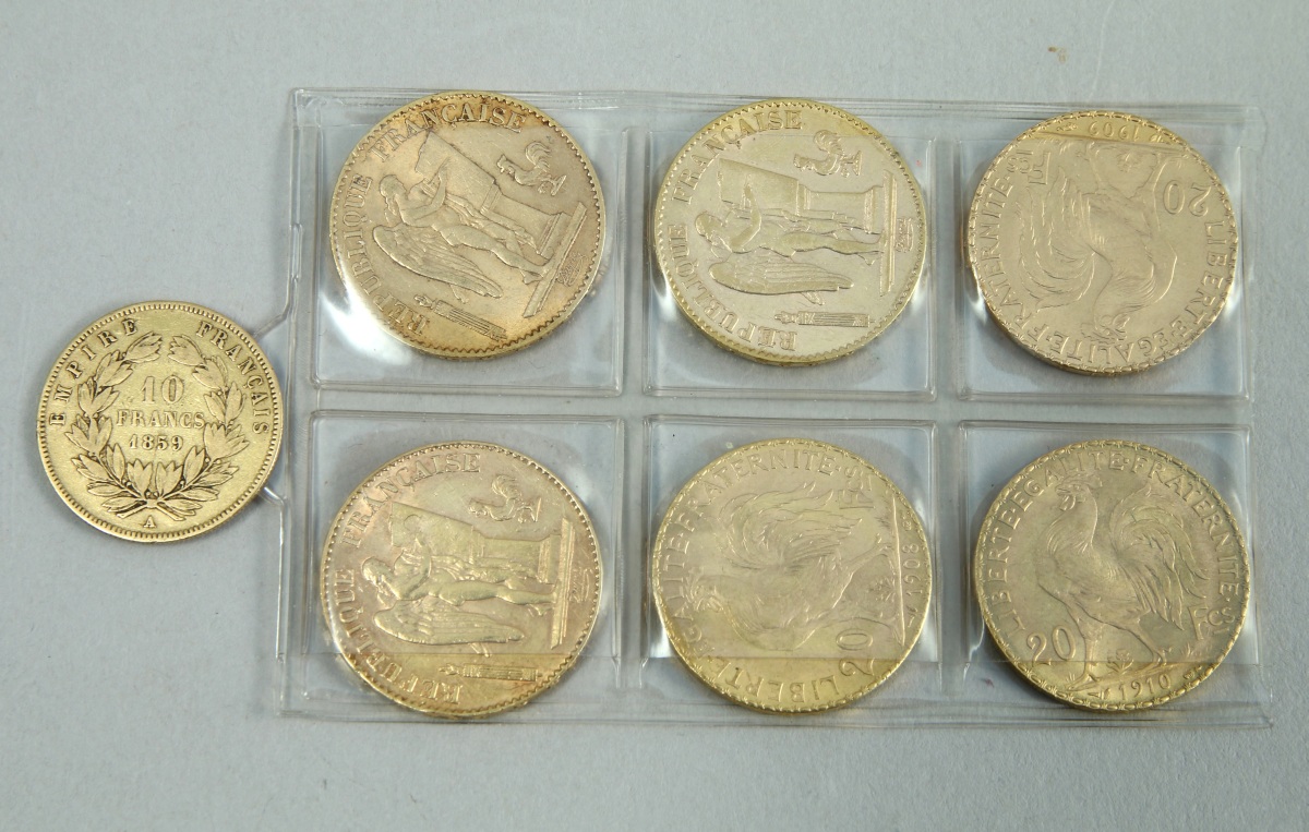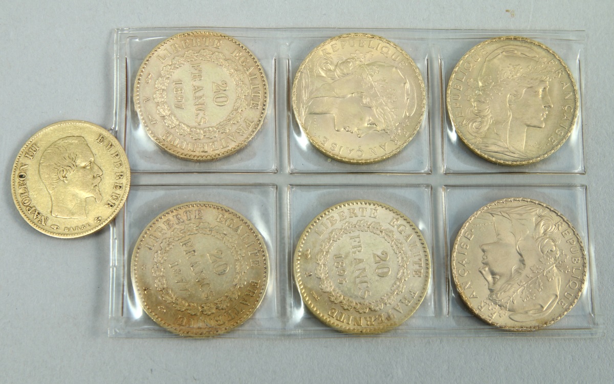 FRANCE. 20 FRANCS or, 6 pièces de (3 Génies 1877-1895-1897, 3 Coqs 1908-1909-1910).