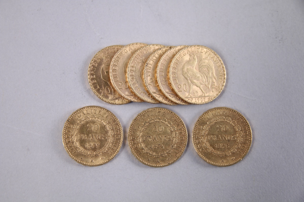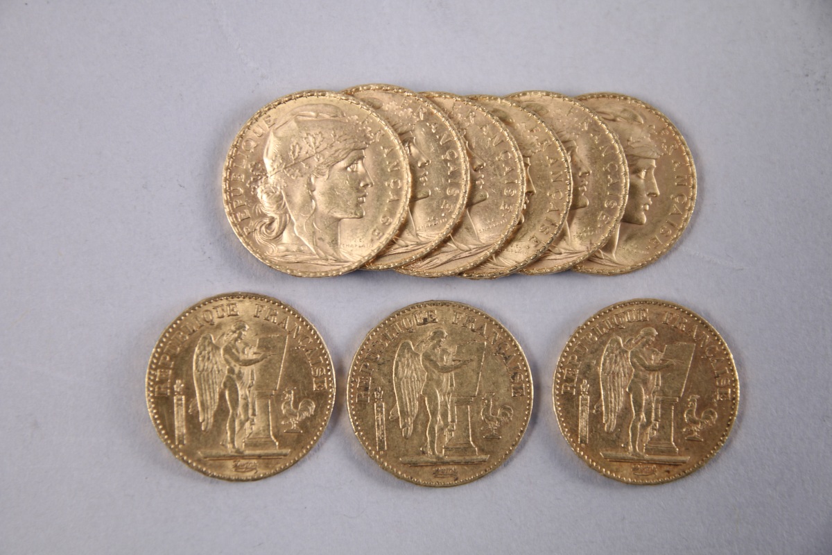 FRANCE. 20 FRANCS or, 9 pièces: 3 pièces Génie, 6 pièces Coq.