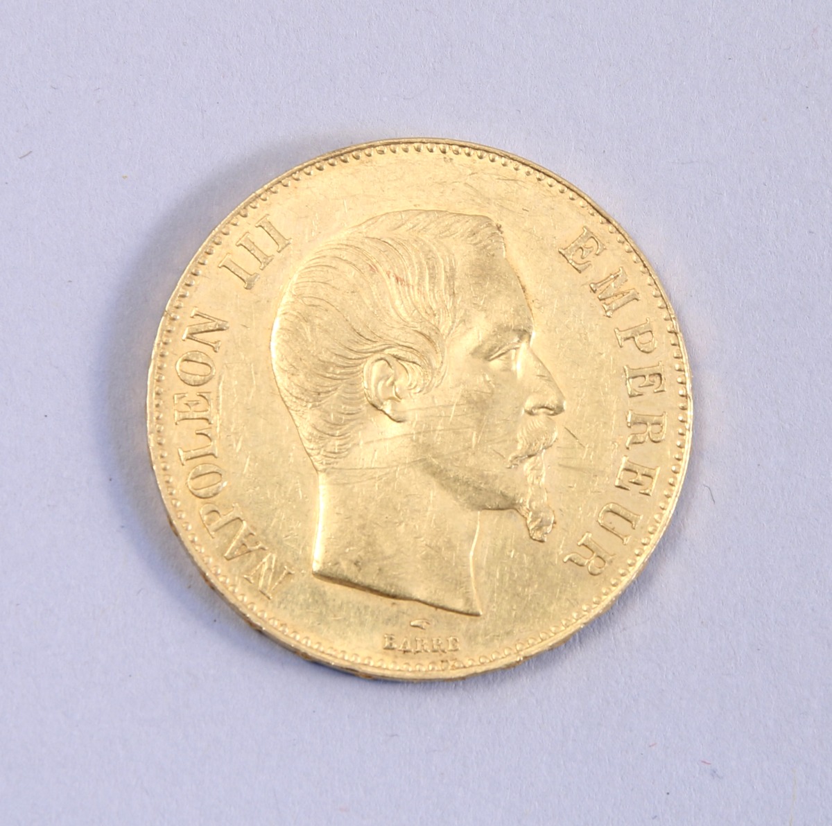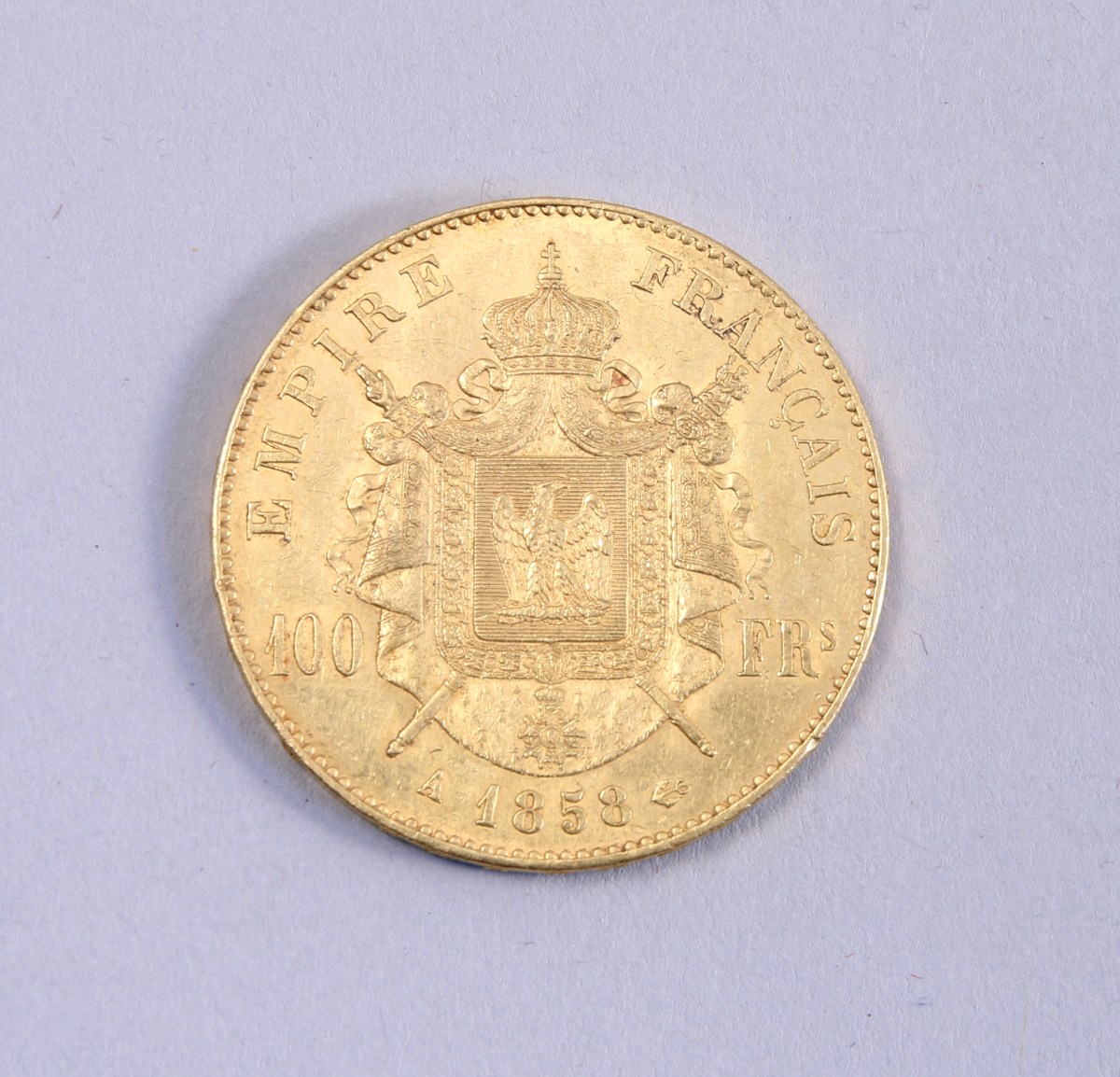 FRANCE. 100 FRANCS or, 1 pièce au profil de Napoléon III tête nue (1858, Paris).