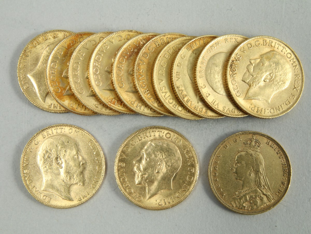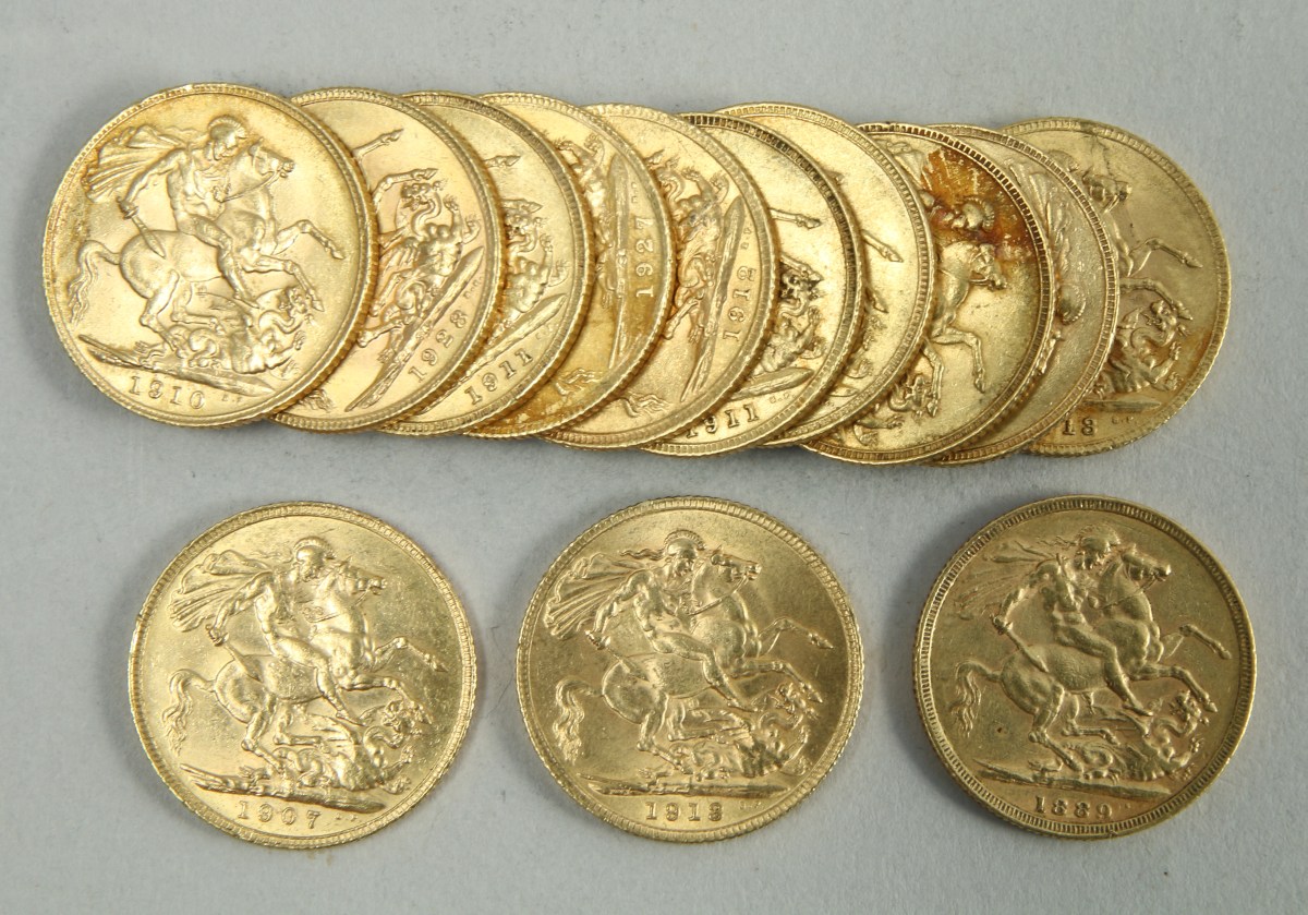 GRANDE-BRETAGNE. 13 pièces SOUVERAIN or. 1 Victoria 1889 ; 4 Edouard VII 1907, 1908, 1910 ; 8 George V 1911 (2), 1912, 1913 (2), 1927, 1928, 1930,