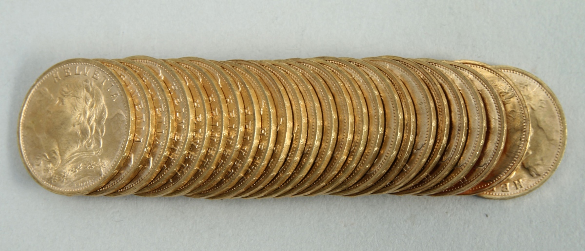 SUISSE. 25 pièces de 20 FRANCS or. SUP.