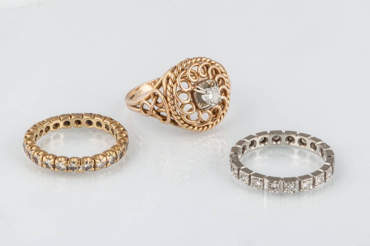 3 BAGUES: 2 alliances américaines avec petits diamants et 1 bague tourbillon or et petit diamant.