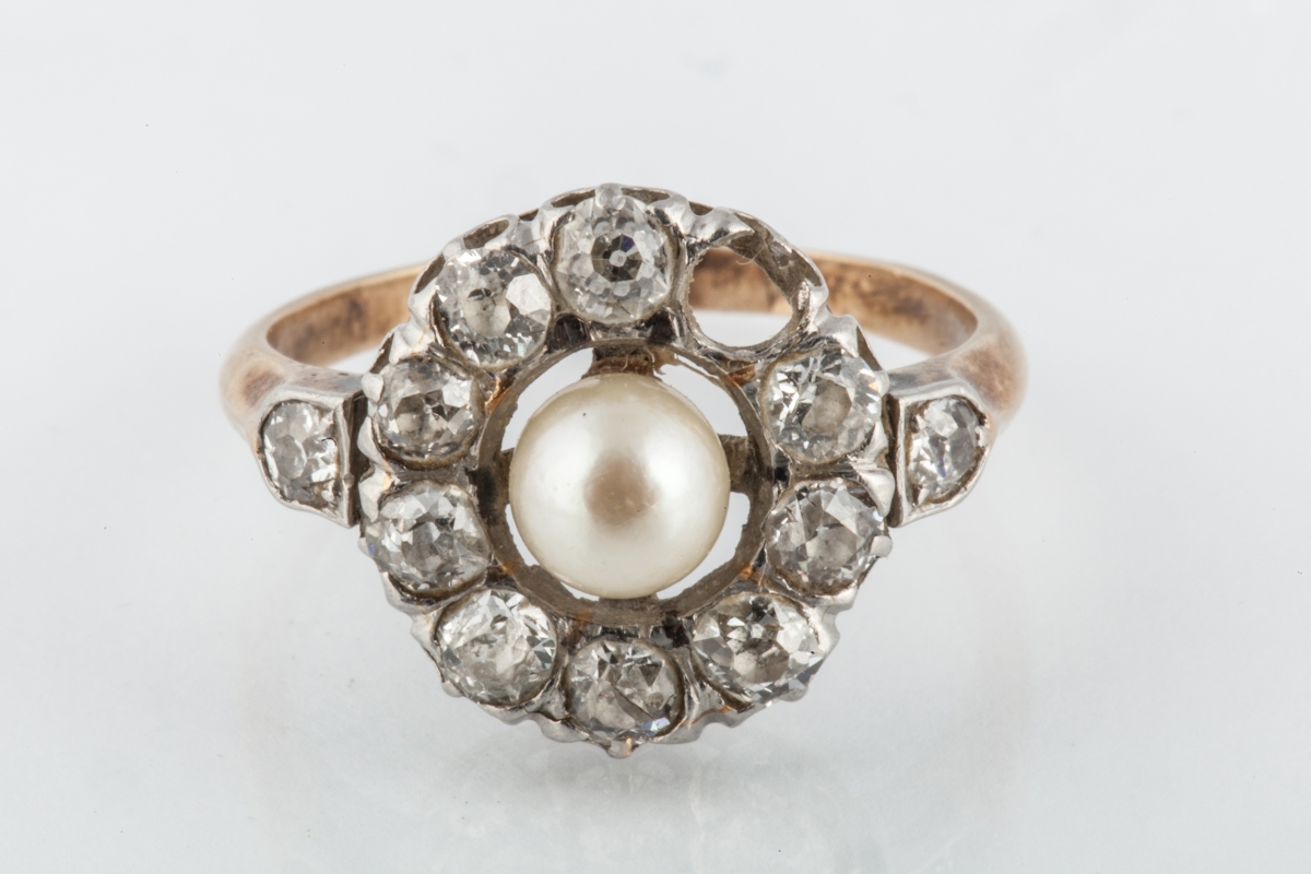 BAGUE MARGUERITE en or jaune et platine (?). Le chaton centré d'une perle dans un entourage de 9 diamants taille ancienne et flanqué de deux autres diamants à l'épaulement.