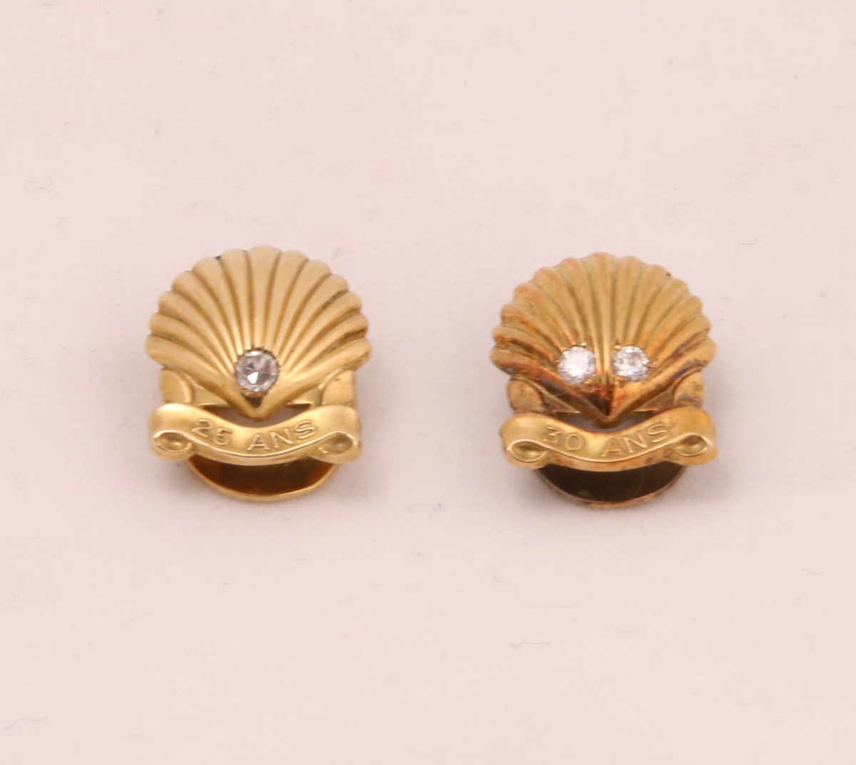 CARTIER. Paire de BOUTONS DE COL en motif de coquille, le premier marqué "25 ans" orné d'un diamant, le second marqué "30 ans" orné de deux diamants. Signés "Cartier Paris".