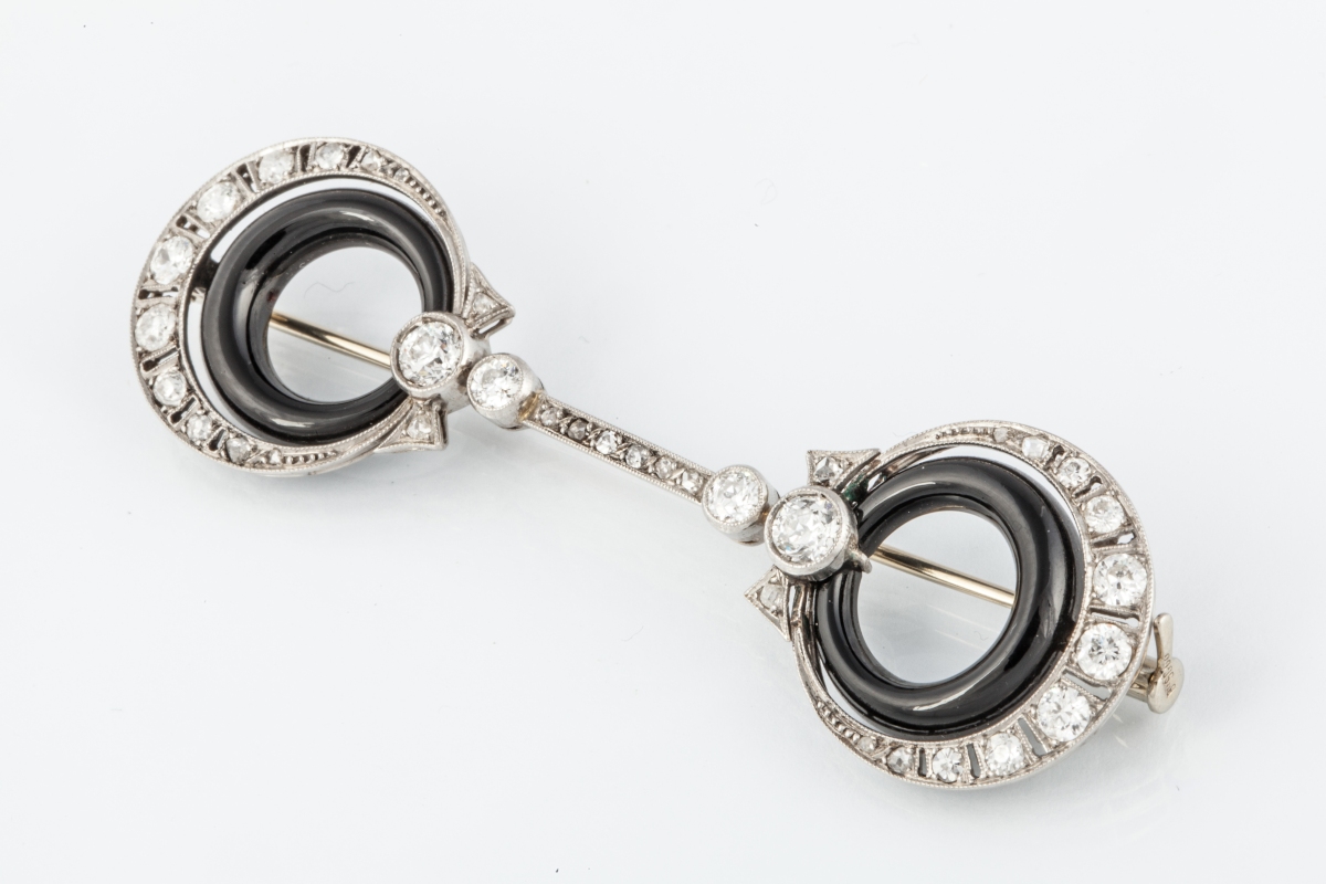 BROCHE en or 18K de deux tons de forme géométrique, les extrémités figurant des cercles ornés d'onyx et diamants ronds de taille ancienne et taillés en rose.