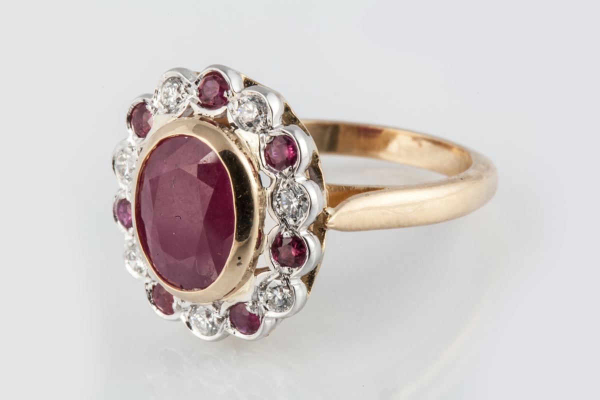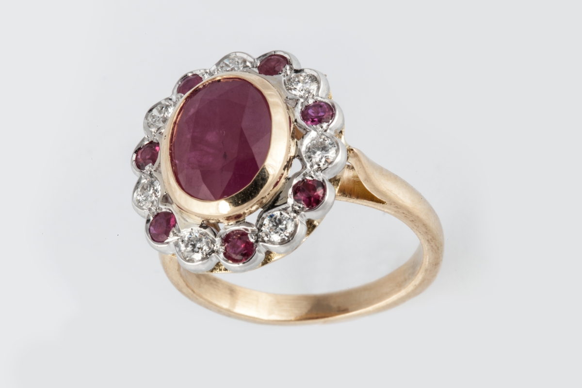 BAGUE de forme ovale festonnée en or de deux tons centrée d'un RUBIS (probablement Birman) taille ovale de 3,04 carats dans un entourage de 7 diamants blancs taille moderne de 0,30 carat en alternance avec 7 rubis ronds de 0,35 carat environ.