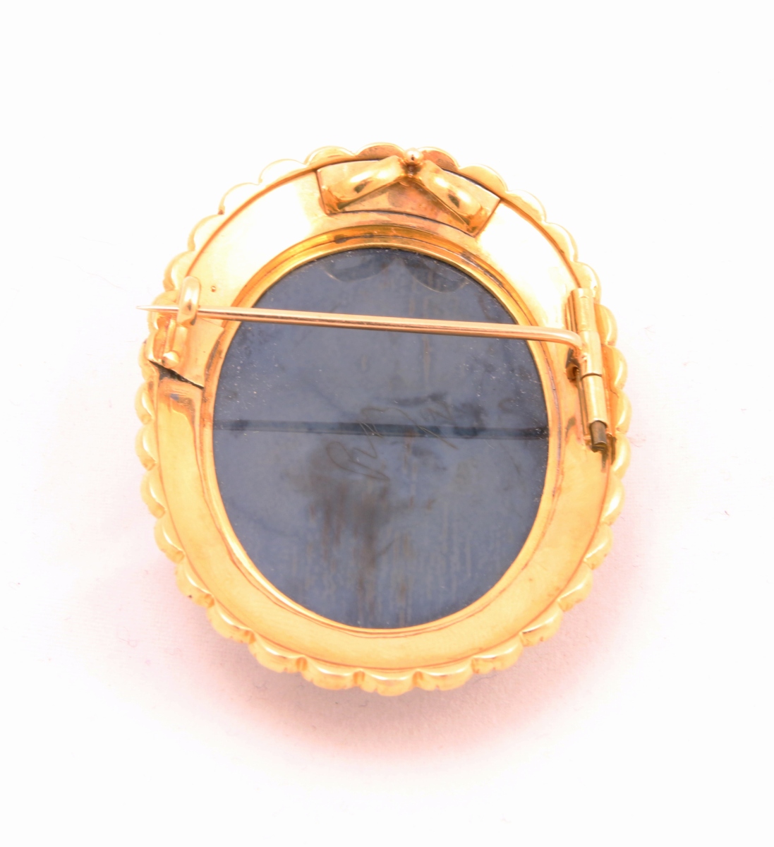 CAMÉE agate de forme ovale figurant, en blanc sur fond bleu-gris, une femme en buste de profil. Se cheveux bouclés tombant sur les épaules sont ornés de pampres de vigne. Monture en or jaune ornée de guillochis et sertie en bordure de demi-perles (manque une).