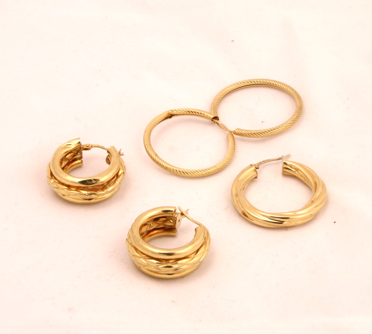 Deux PAIRES de BOUCLES d'OREILLES CRÉOLES et une BOUCLE solitaire en or jaune, la plus petite paire à trois anneaux, la plus grande paire et la boucle seule torasadée.