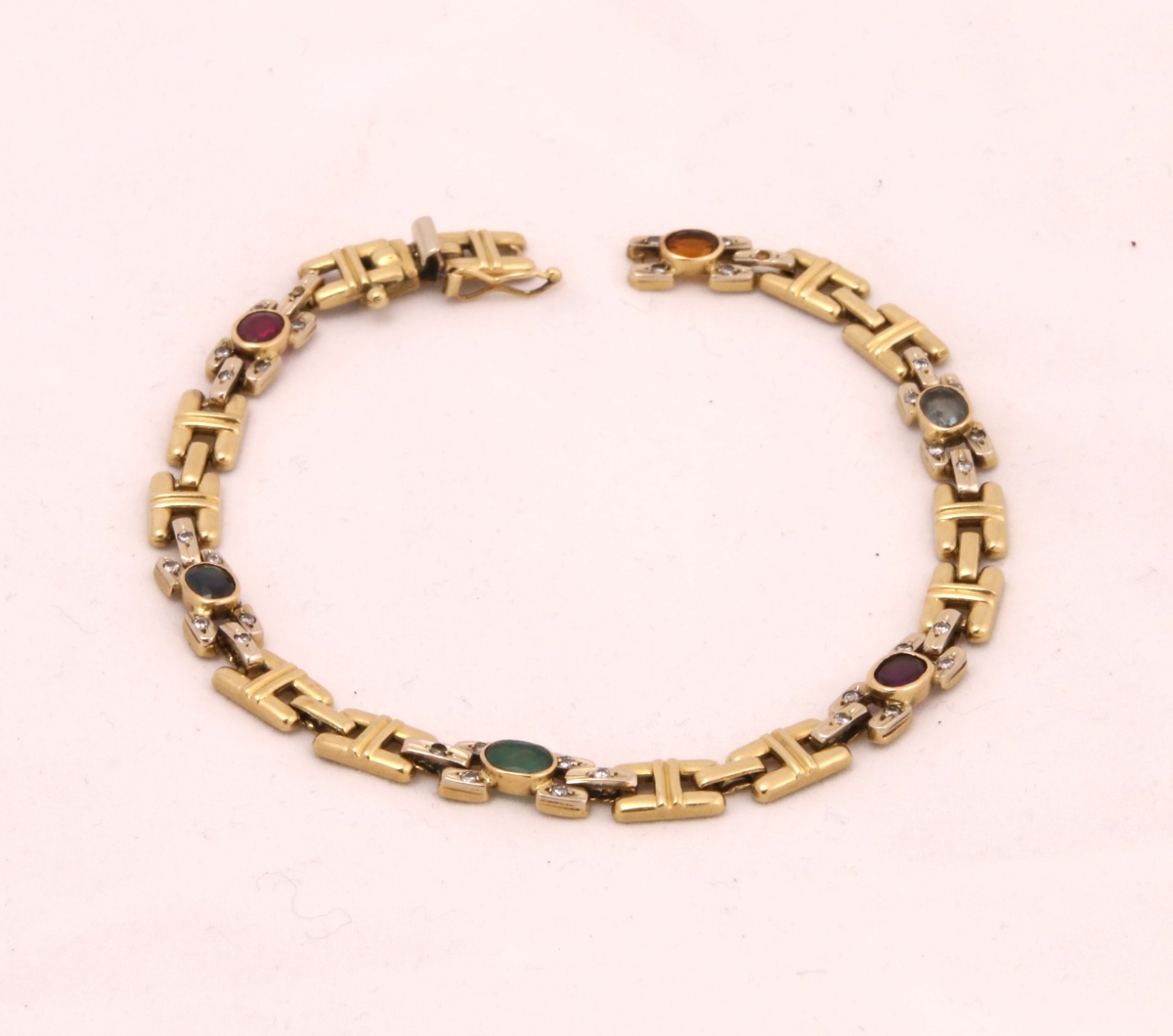 GOURMETTE en or jaune à mailles en H ornée de six pierres de couleur (améthiste, grenat, saphirs...?) et de petits brillants.