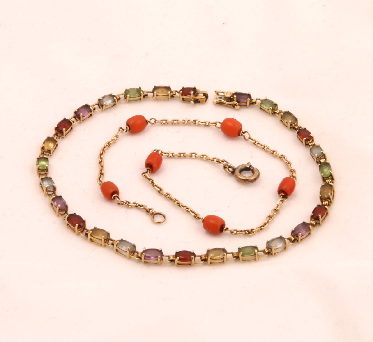 Deux GOURMETTES en or jaune, l'une ornée de 27 pierres de couleur et l'autre de 6 perles de corail.
