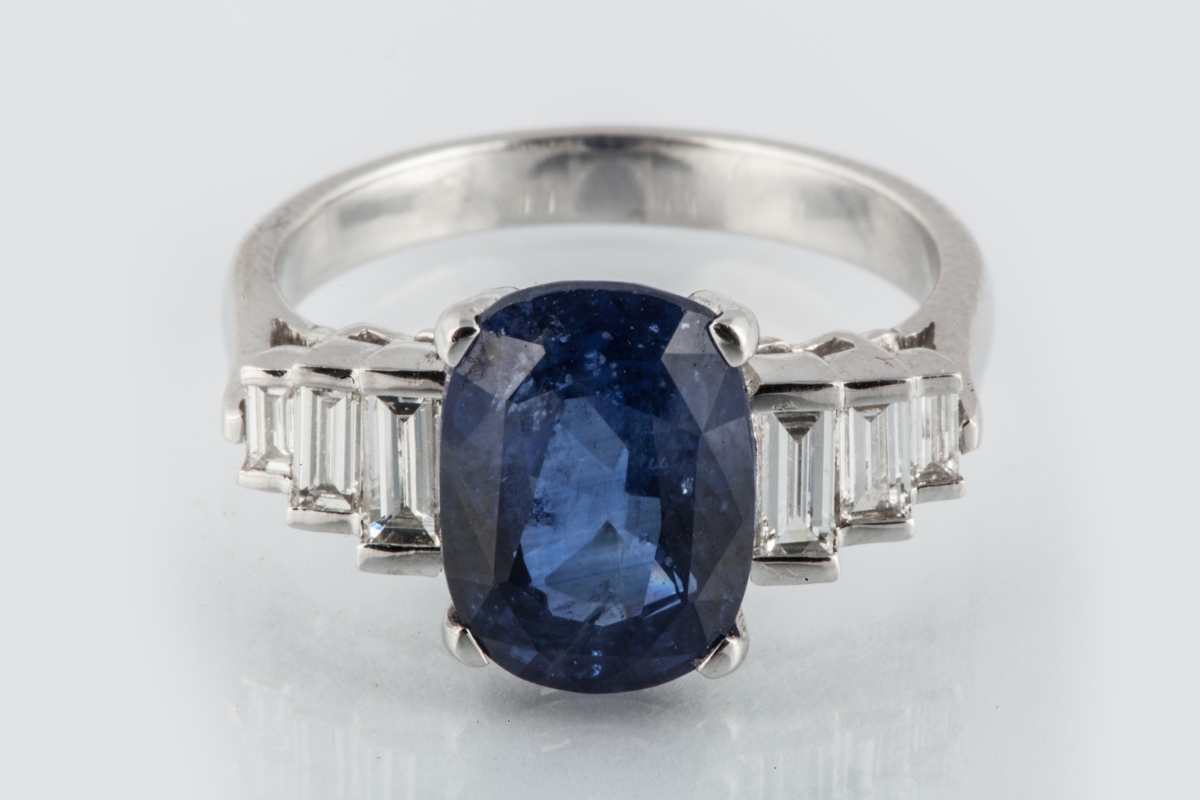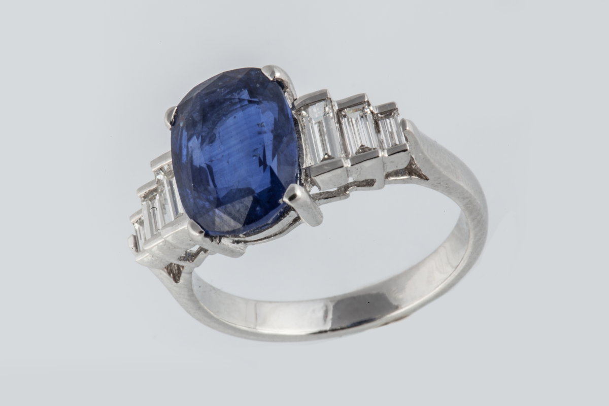 BAGUE en or blanc sertie d'un SAPHIR taille ovale de 4,55 carats épaulé de 6 diamants blancs taille baguette de 0,40 carat environ.