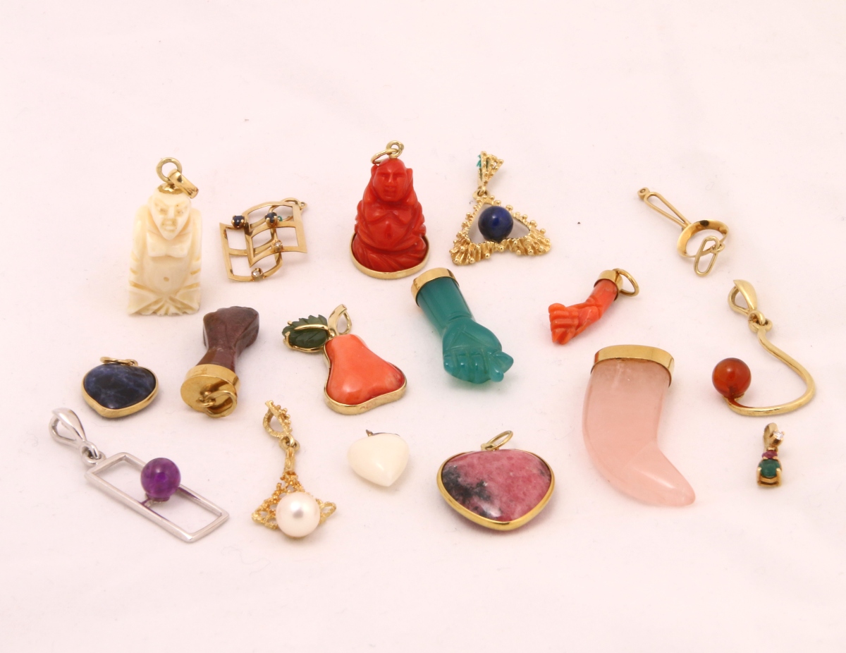 17 PENDENTIFS, monture et anneau de bélière en or jaune ou blanc 18k, dont poire et bouddha en corail, griffe en quartz, avant-bras en jadéïte etc...