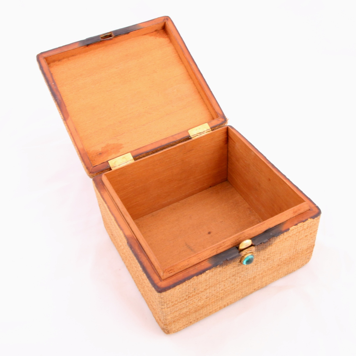 BOITE À BIJOUX de forme rectangulaire en bois recouverte de vannerie. Le couvercle ornée d'un noeud en or jaune avec deux turquoise et trois brillants. Le bouton poussoir en cabochon vert. Charnières en or jaune.