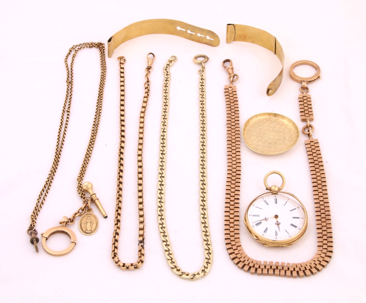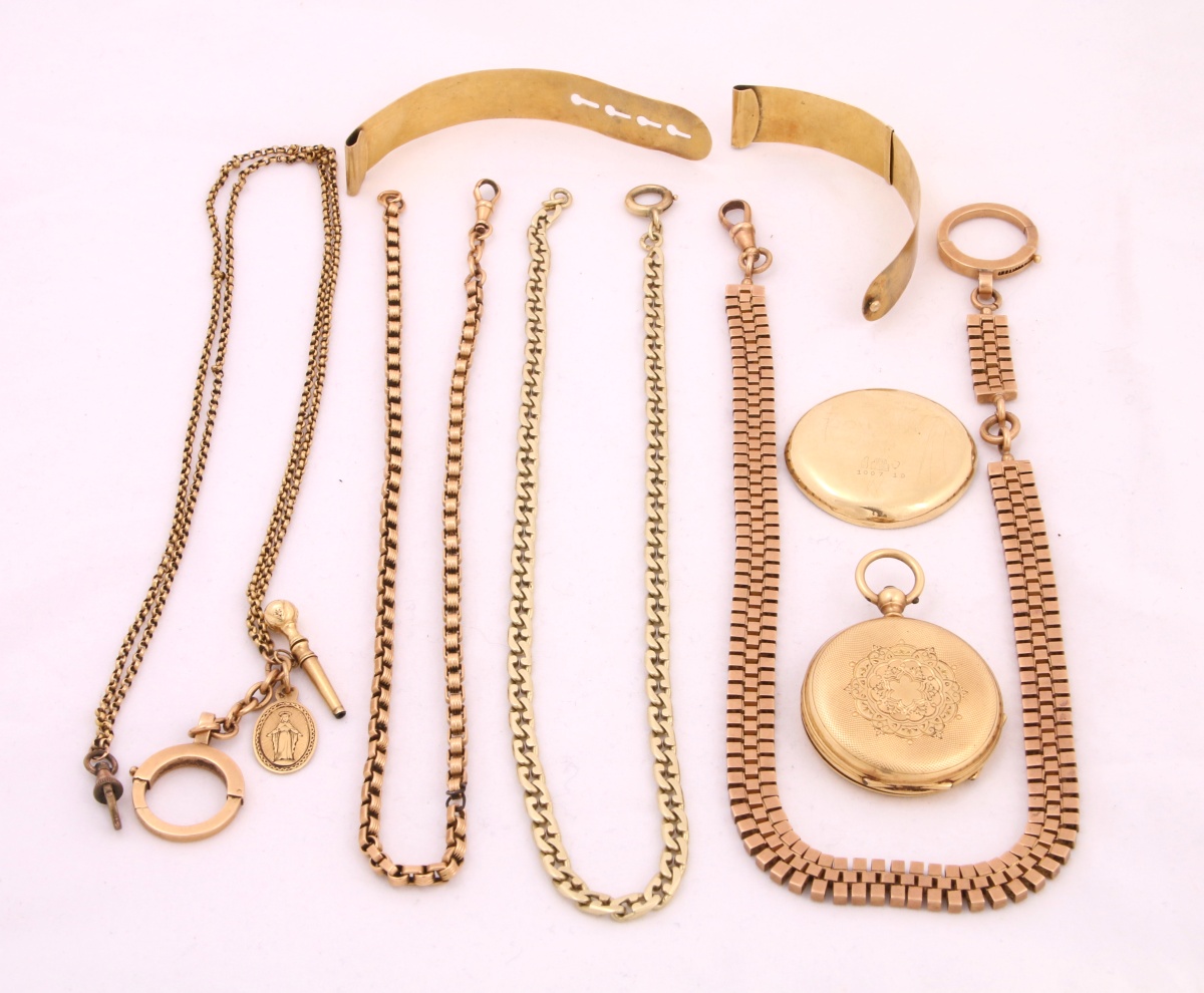- 4 CHAÎNES GILETIÈRES, dont une double agrémentée d'une médaille miraculeuse et d'une clef de montre (un fermoir en métal). Long. 34,5, 35,5, 36 et 36,5 cm. Poids brut: 75 g.