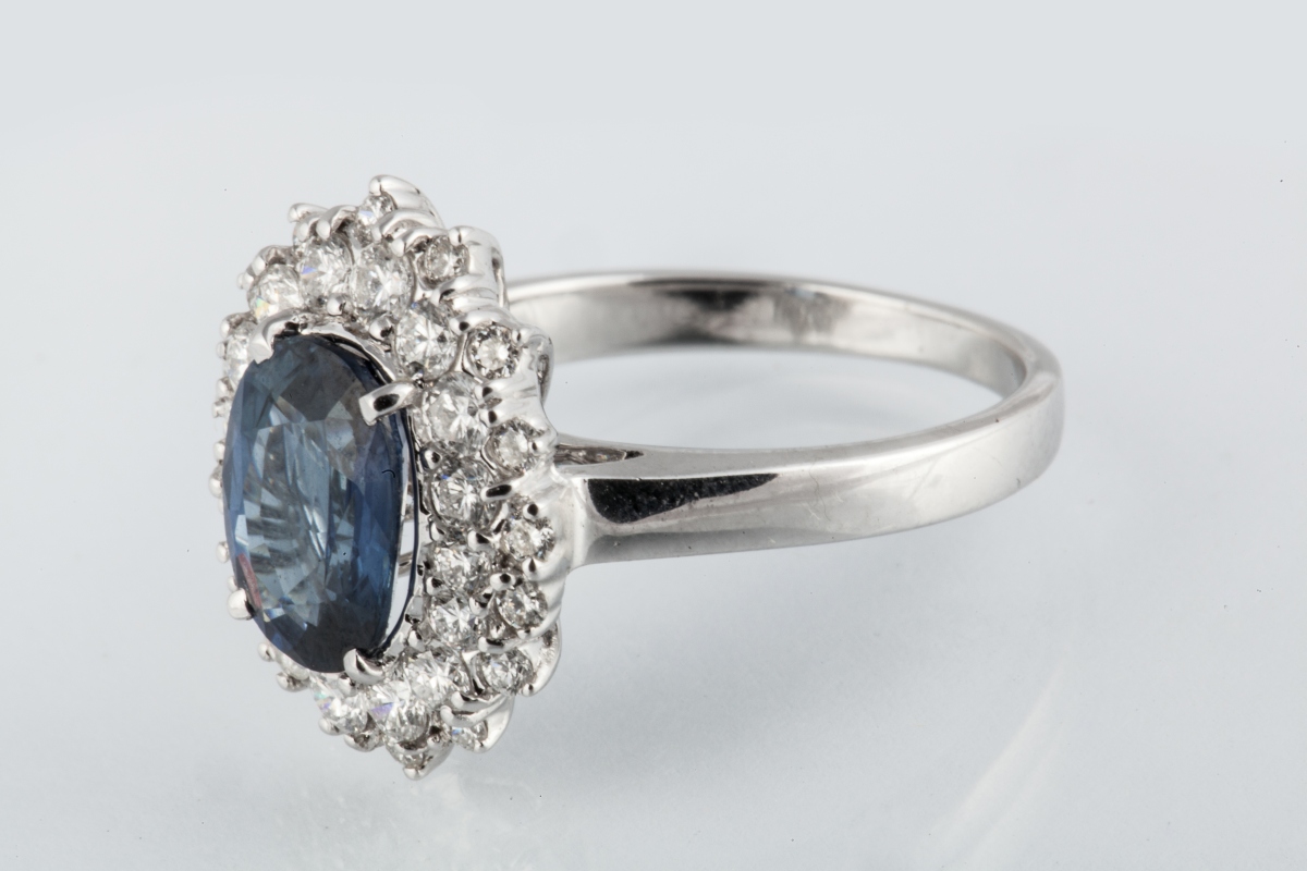 BAGUE de forme ovale en or blanc ornée d'un SAPHIR taille ovale de 2,40 carats environ dans un double entourage de 32 diamants blancs taille moderne de 0,90 carat.
