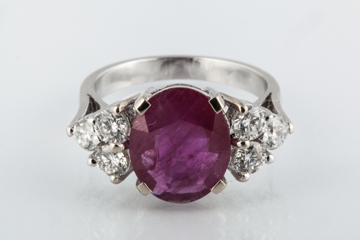 BAGUE en or blanc ornée d'un RUBIS (probablement Birman) taille ovale de 3 carats épaulé de 6 diamants blancs taille moderne de 0,90 carat environ.