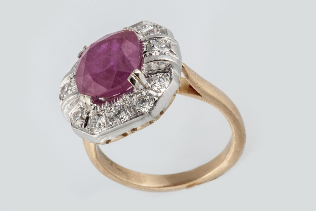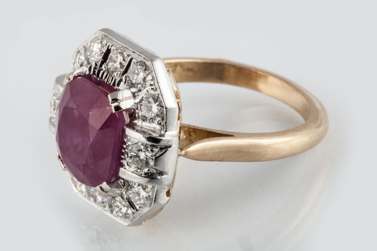 BAGUE de forme rectangulaire à pans coupés en or de deux tons centrée d'un RUBIS (probablement Birman) taille coussin de 4,90 carats environ entouré de 12 diamants blancs taille moderne de 1 carat environ.