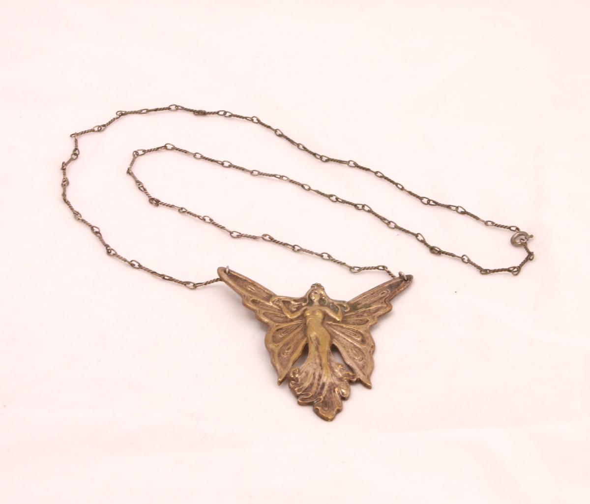 PENDENTIF en métal argenté figurant une fée. Chaîne à maille torse.