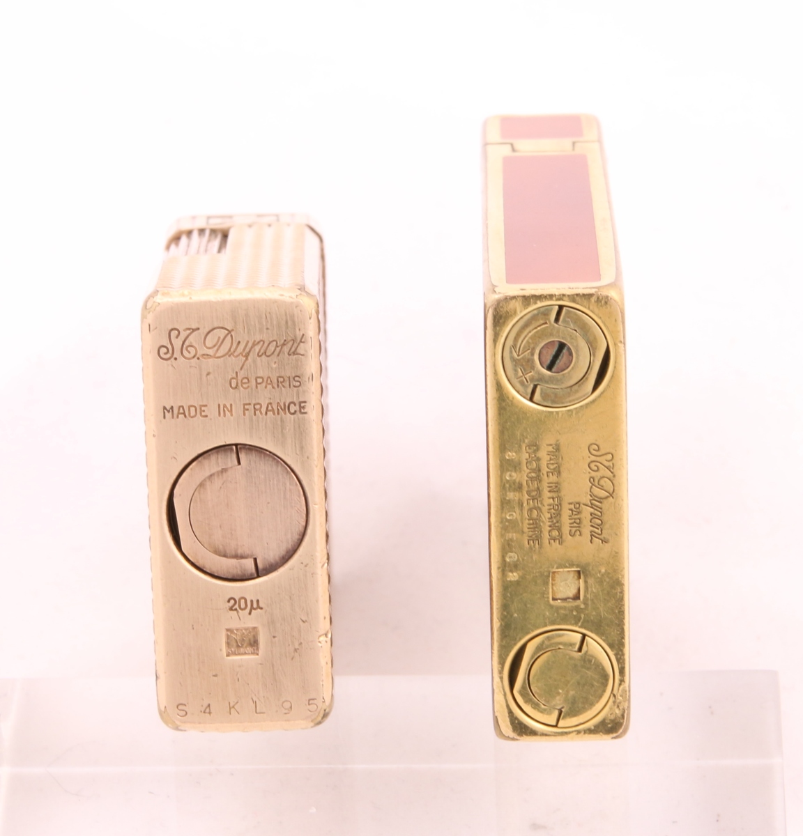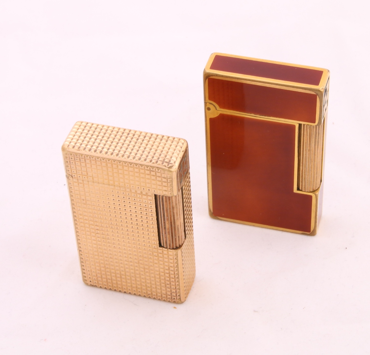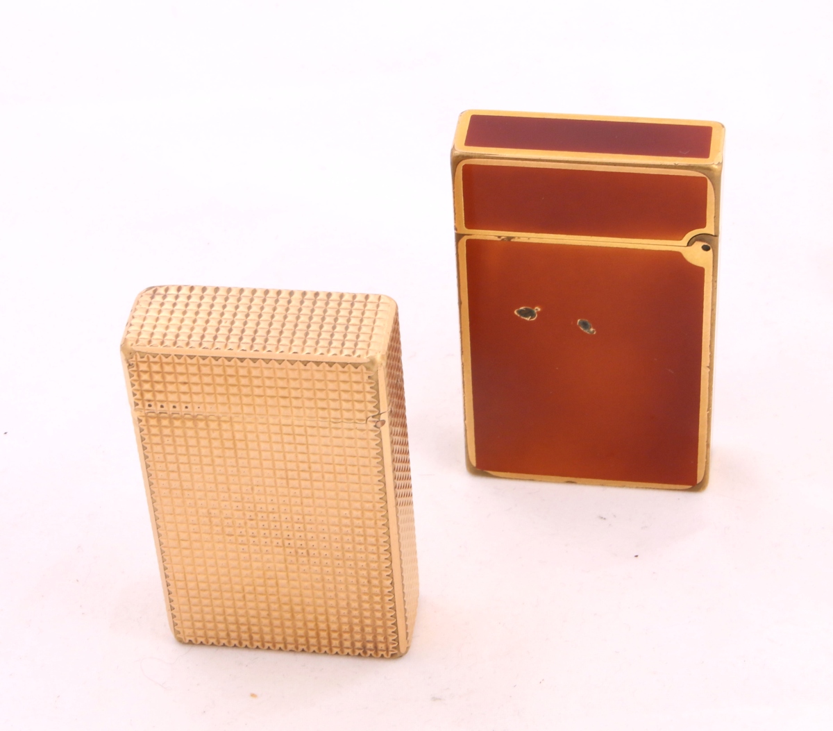 DUPONT. 2 BRIQUETS, l'un en métal doré guilloché et l'autre en laque fauve (accidents).
