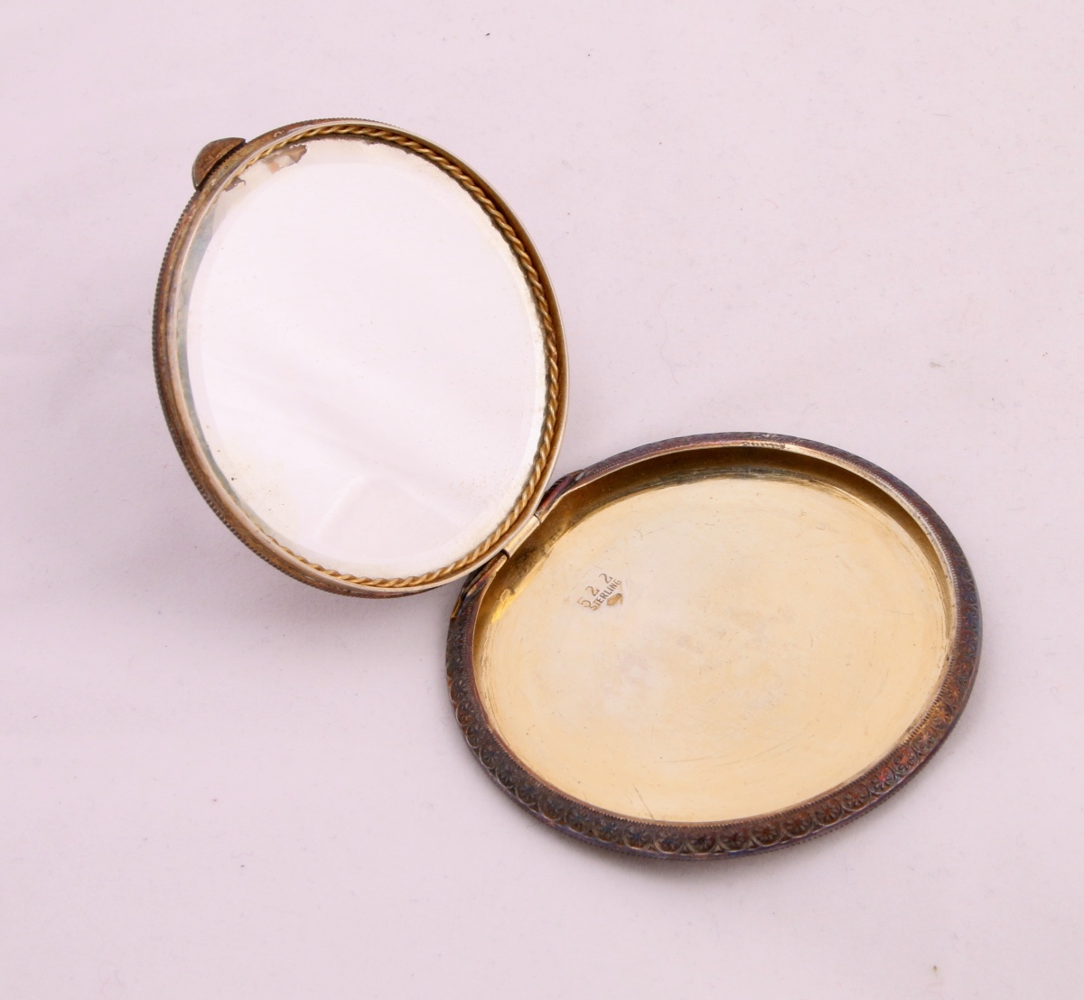 POUDRIER argent, de forme circulaire, doublement orné d'entrelacs et fleurettes émaillés sur fond mauve-rose. Travail anglais.