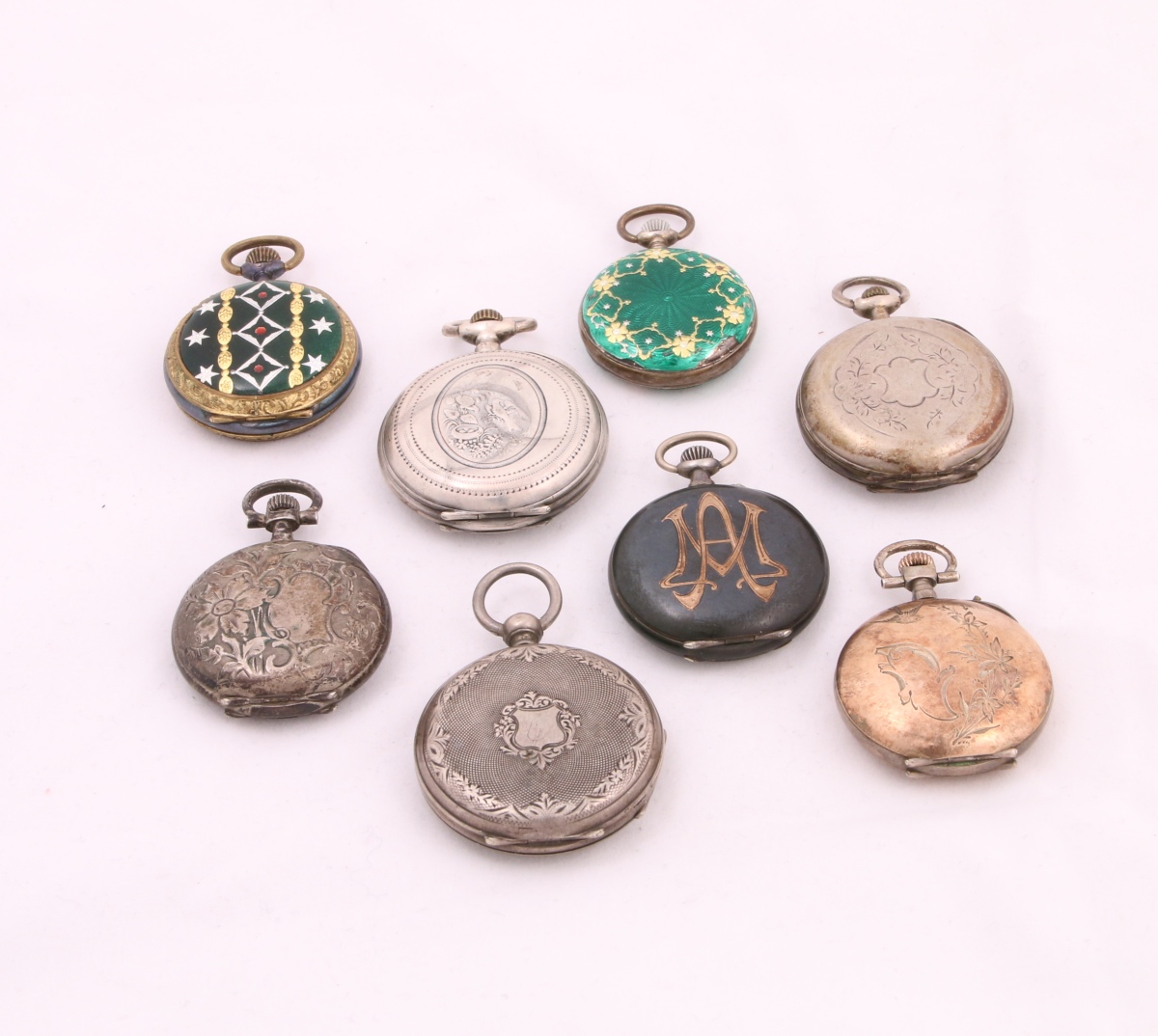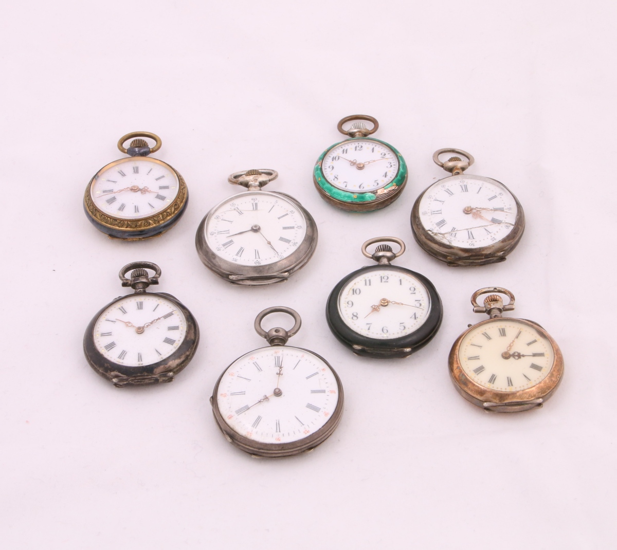7 MONTRES de COL à remontoir au pendant, le cadran de forme ronde émaillé blanc: