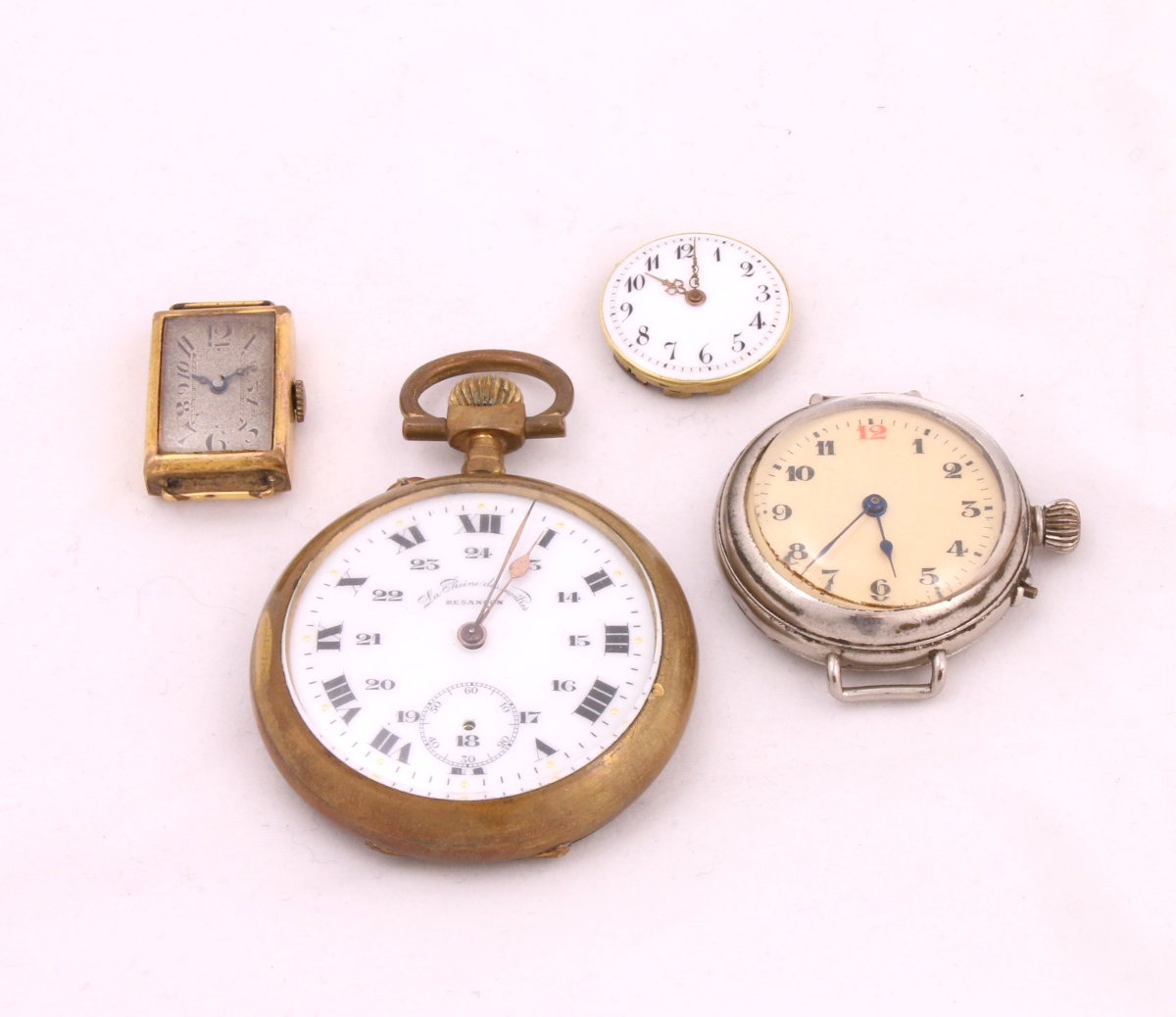 - MONTRE DE GOUSSET à remontoir au pendant en laiton. Double cadran émaillé blanc, heures et secondes signé "La Reine des Montres / Besançon". Diam. 4,5 cm.