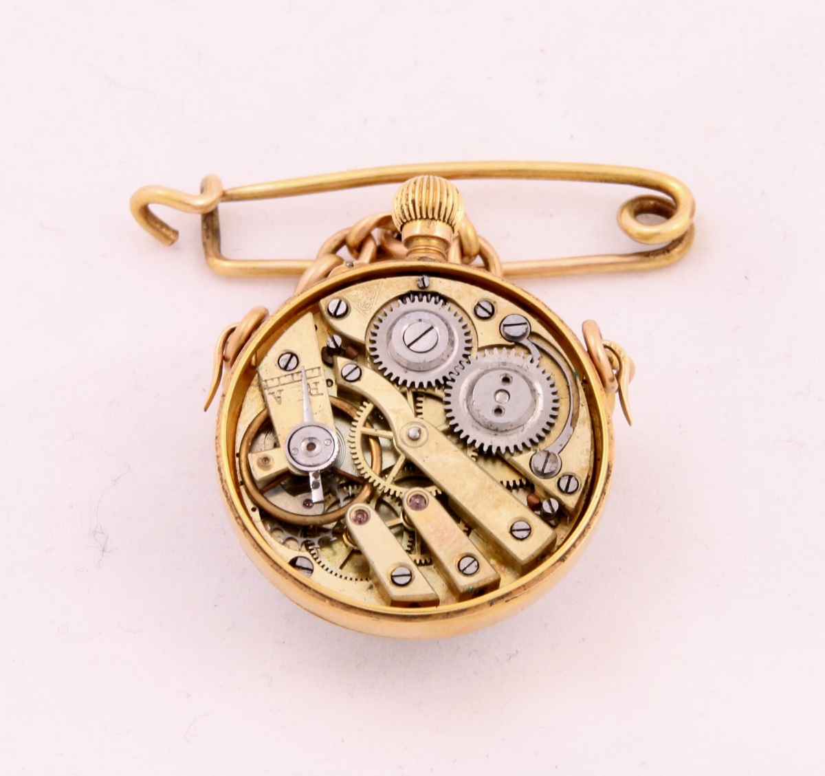 MONTRE BOULET à remontoir au pendant en or à verres bombés grossissants. Cadran émaillé blanc indiquant les heures en chriffres romains. Elle est retenue par deux chaînes réunies à une épingle à nourrice.