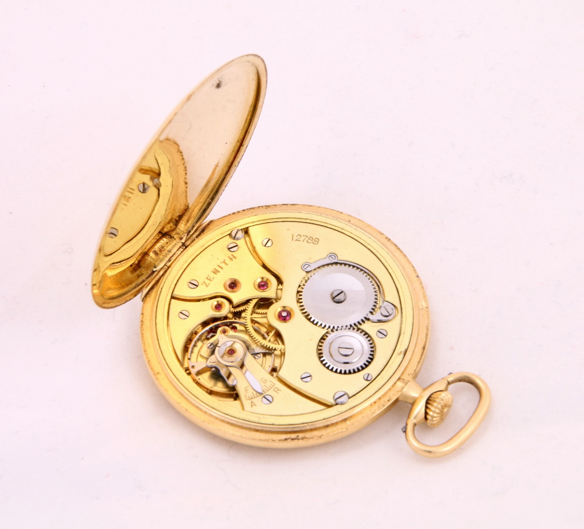 ZENITH. MONTRE DE GOUSSET extra plate à remontoir au pendant en or. Double cadran, heures et secondes, en métal doré amati. Aiguilles en acier bleuï. Numérotée 12788.
