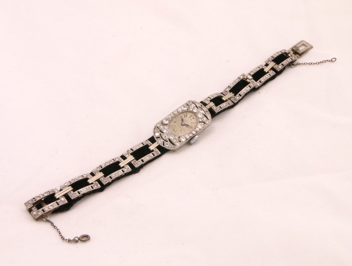 MONTRE-BRACELET de coktail pour dame en platine. Le boîtier de forme oblongue agrémenté de palmettes styliséees et le bracelet à mailles rectangulaires entièrement pavés de petits diamants. Les flancs du boîtier gravés de deux félins affrontés.