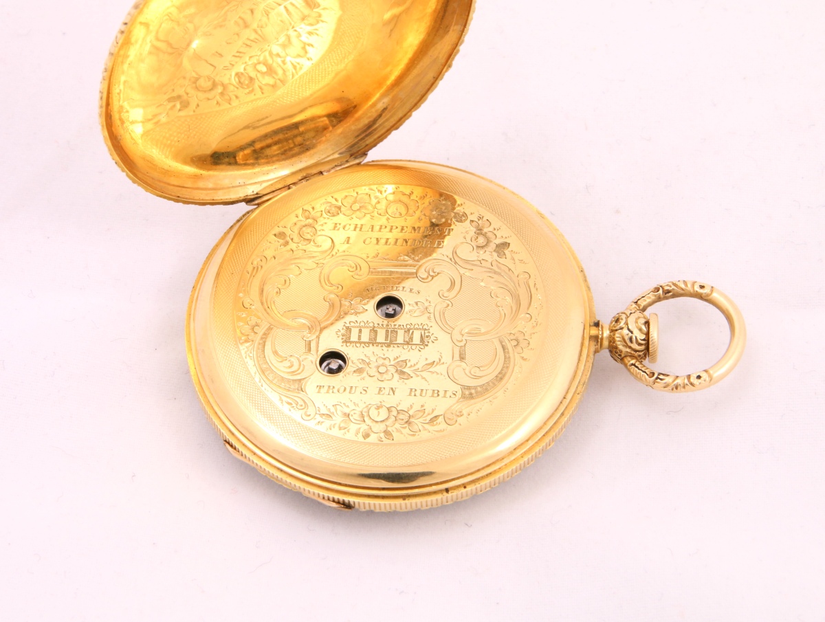 MONTRE de GOUSSET à sonnerie, à clef, en or jaune. Le dos centré d'un cartouche gravé d'un portrait en buste du général Lazare Hoche dans un riche encadrement de rinceaux. Cache-poussière marqué "Echappement à cylindre / Huit / trous en rubis". Cadran émaillé blanc indiquant les heures en chiffres romains.
