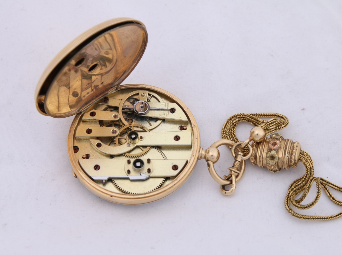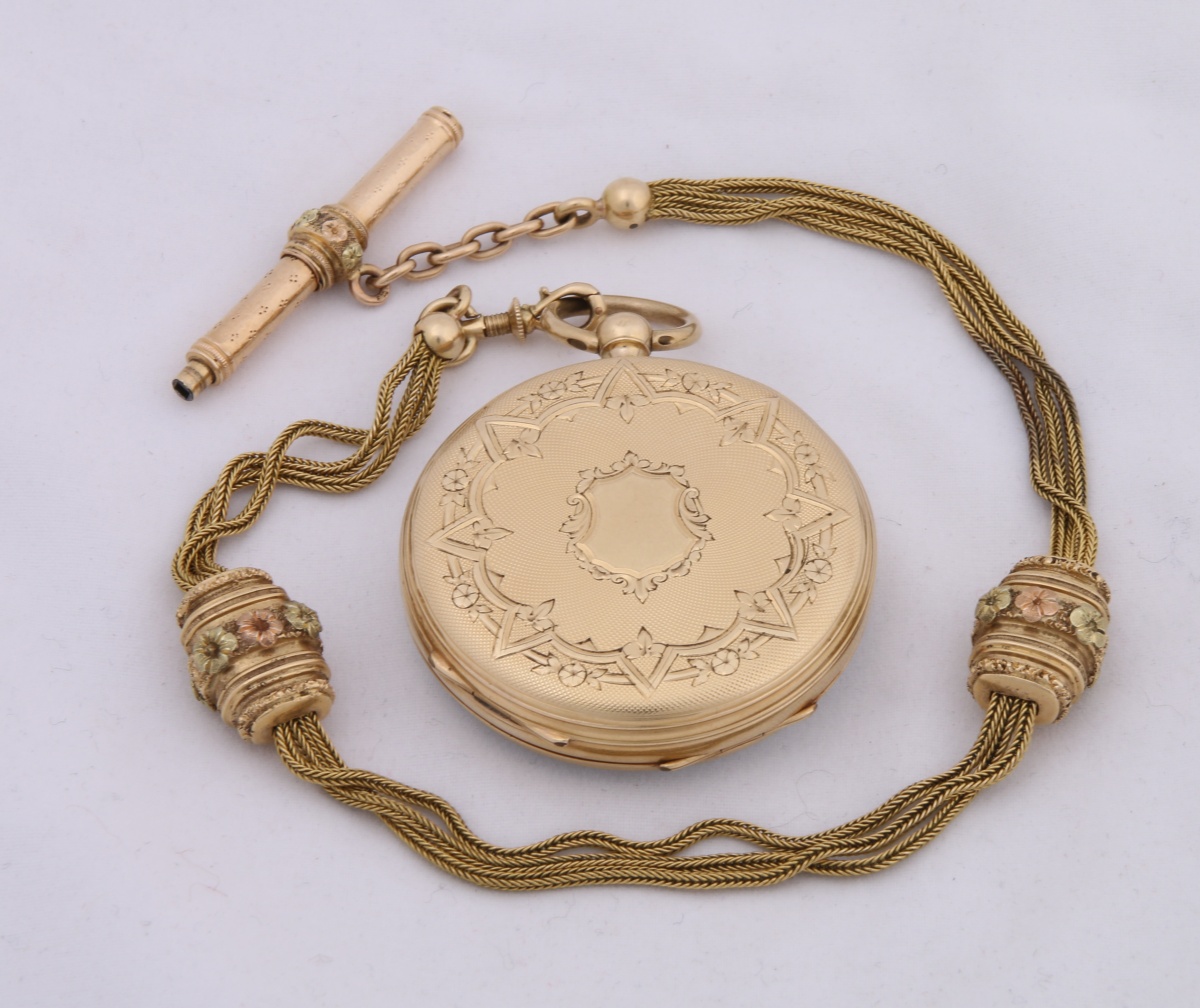 MONTRE d'homme en or, remontoir à clé. Et sa châtelaine à deux coulissants en or de deux tons. Fin XIXe.