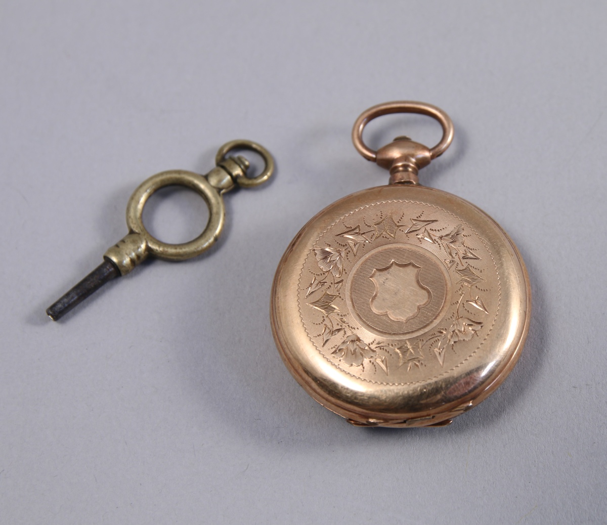 Petite MONTRE de GOUSSET en or jaune, le boitier gravé de cuir en enroulement et d'une frise feuillagée.Cadran en émail marqué des heures en chiffres romains, gradué pour les minutes avec chaque période de cinq minutes en chiffres arabes. Remontage à clé.