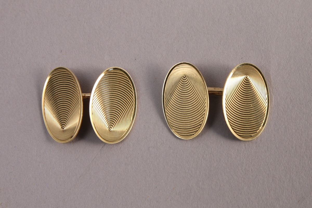 Paire de BOUTONS DE MANCHETTES de forme ovale en or jaune. Décor de stries rayonnantes concentriques. Poinçon tête d'aigle et poinçon de maître P,?, M.