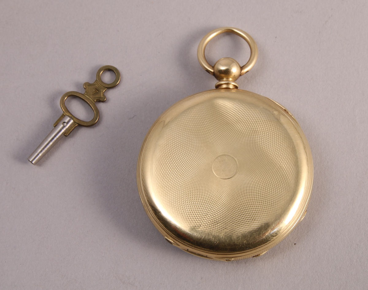 MONTRE DE GOUSSET à clef en or jaune. Double cadran émaillé blanc indiquant les heures en chiffres romains, les 5 minutes et les dix secondes en chiffres arabes. Dos guilloché. Cache-poussière marqué "Berguer & fils / Grand Quai N'30 / Genève / Echappement à cylindre / huit trous rubis / N''8119".