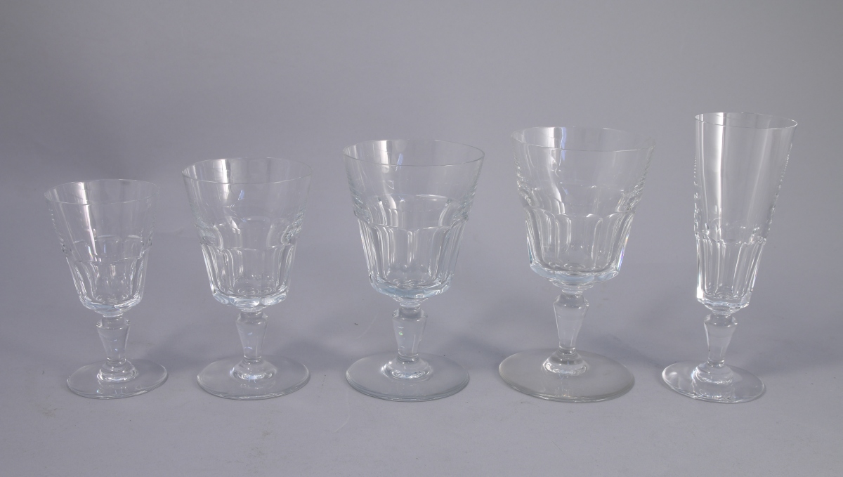 BACCARAT. SERVICE DE VERRES "MISSOURI" en cristal signé, 46 pièces: 5 flûtes à champagne (Haut. 170, Diam. 57 mm), 12 verres à eau (Haut. 155, Diam 89 mm), 8 verres à vin rouge (Haut. 145, Diam. 85 mm), 10 verres à vin blanc (Haut. 135, Diam. 77 mm) et 11 verres à liqueur (Haut. 120, Diam. 65 mm).