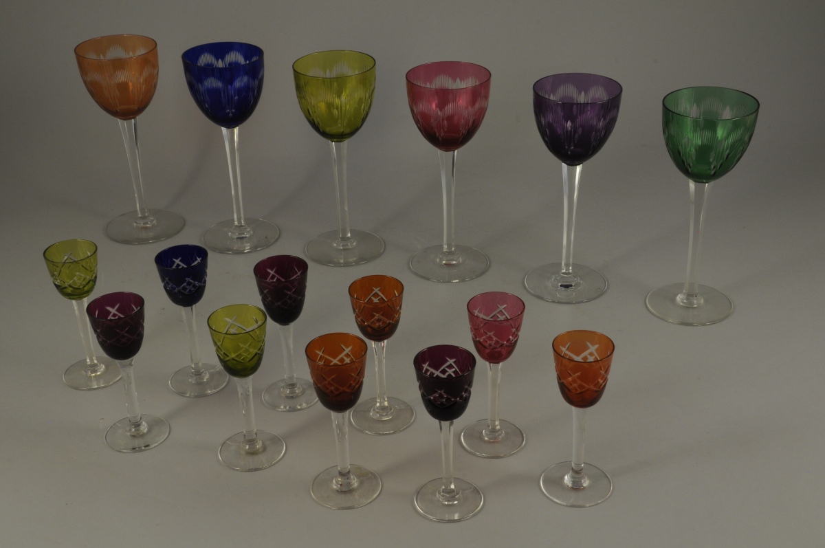 BACCARAT. SERVICE DE" VERRES DU RHIN " en cristal taillé de différentes couleurs, non signés, 22 pièces: