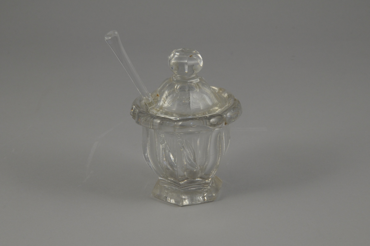 BACCARAT. 3 MOUTARDIERS "HARCOURT" en cristal. Haut. 10 cm.JOINT: 2 CUILLERES en cristal.
