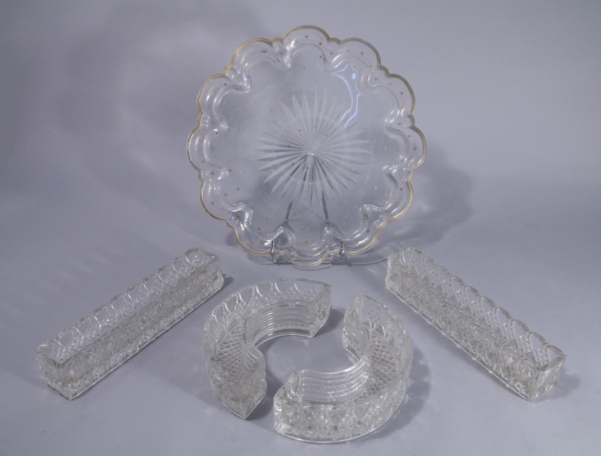 JOINT: PLAT en cristal de forme polylobée. Taillé en son centre d'une rosace et semé d'étoiles dorées. XXe. Diam. 30,5 cm.