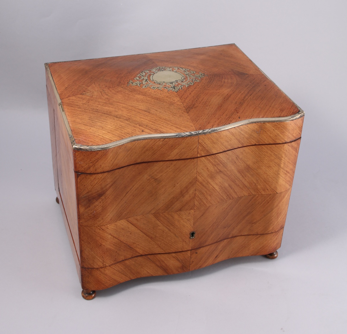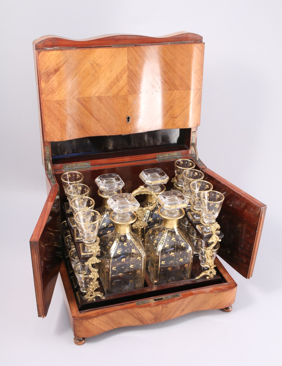 CAVE À LIQUEUR en placage, la façade de forme arbalète, ouvrant par un abattant sur le dessus et par deux vantaux sur les côtés. Il renferme 4 carafons et 16 verres à liqueur à décor à l'or de fleurs.
