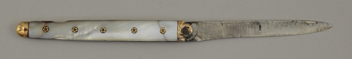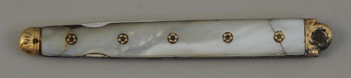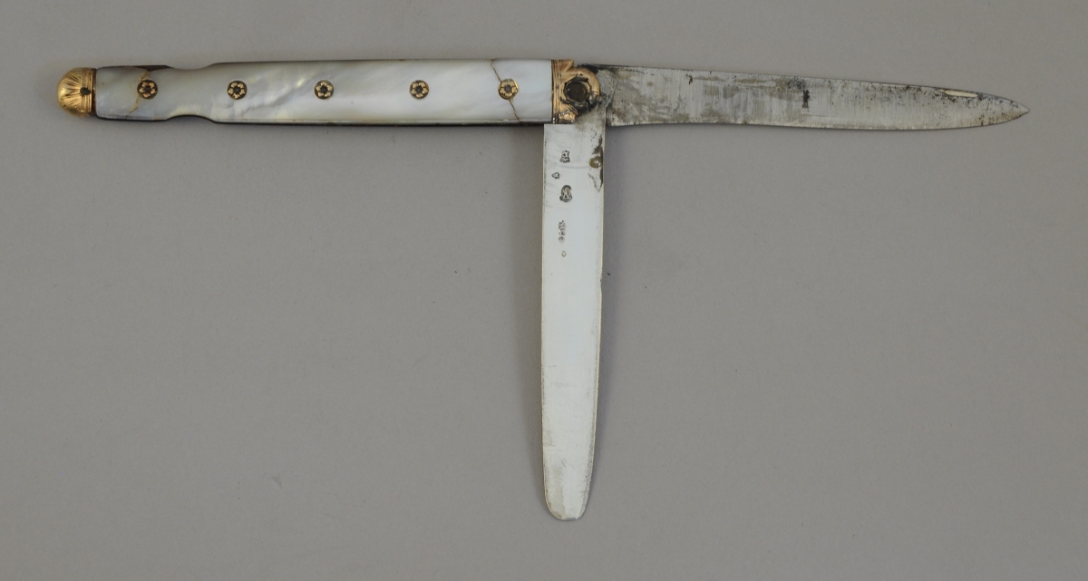 ORLÉANS. COUTEAU DE VOYAGE dit "à tête de compas" à deux lames, l'une en acier, l'autre en argent. Manche à plaquettes de nacre incrustées de fleurettes d'or sur les cloutages. Mitres en or.