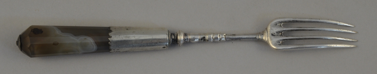 - FOURCHETTE à piquer en argent. Le manche en agate facetée. Poinçon au cygne.