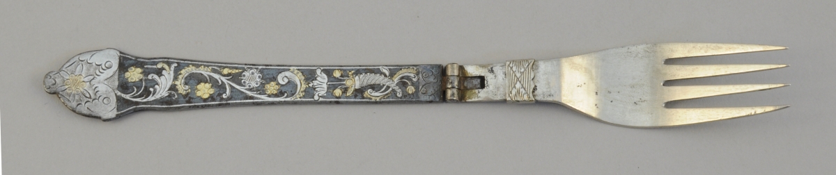 - FOURCHETTE PLIANTE en métal. Manche en acier niellé et doré orné de motifs feuillagés.