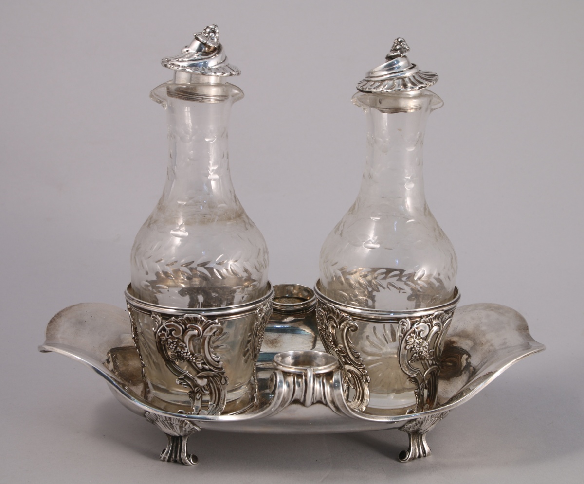 PARIS. HUILIER-VINAIGRIER de forme oblonge en argent. Le bassin à bords chantournés est orné d'enroulements à la hauteur des repose-bouchons. Il repose sur quatre pieds à attaches coquille. Les porte-carafons reçoivent un décor ciselé et ajouré d'agraphes, pampres de vigne et acanthes stylisées. Avec ses deux bouchons garnis de liège à fretel fugurant une grappe de raisin.
