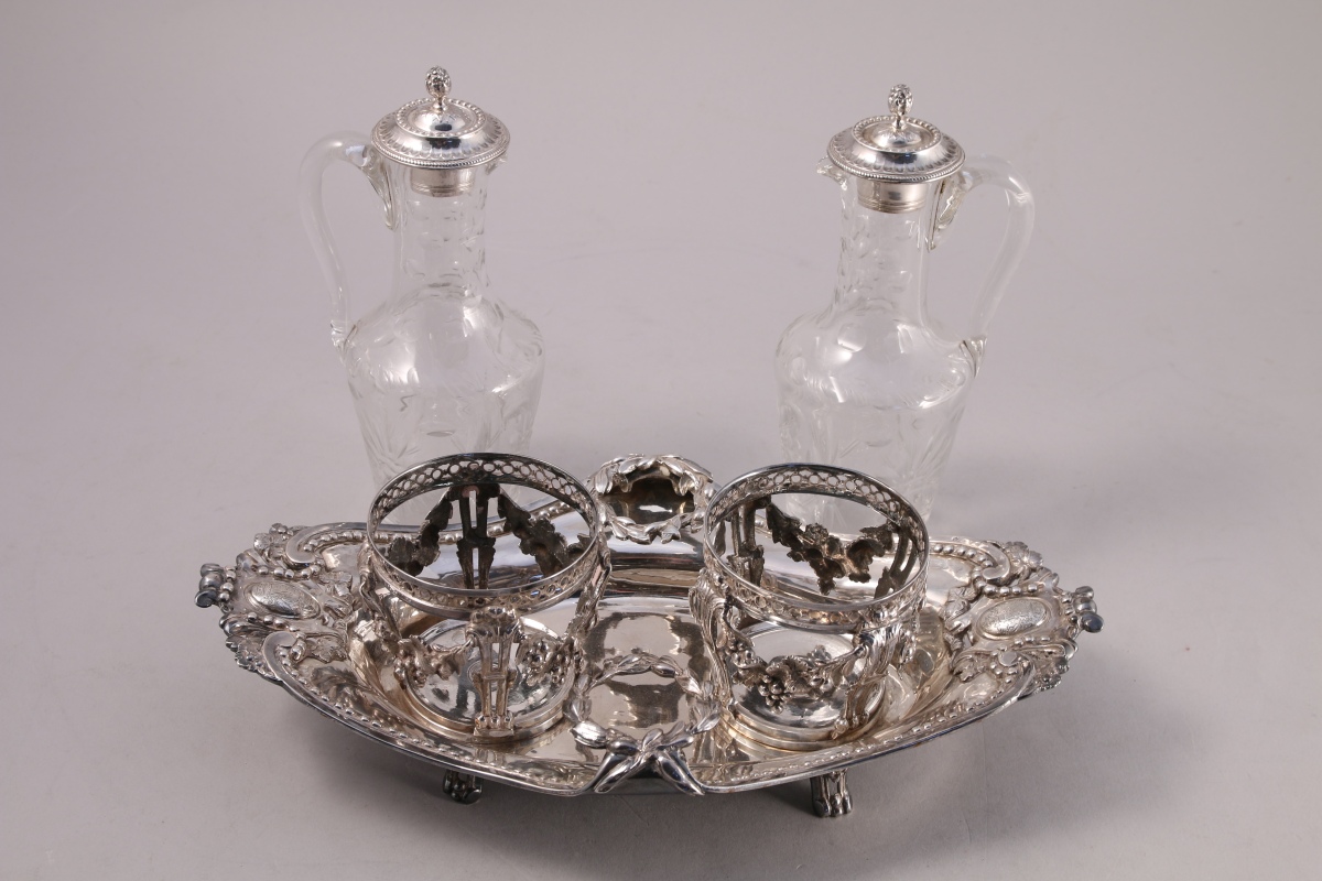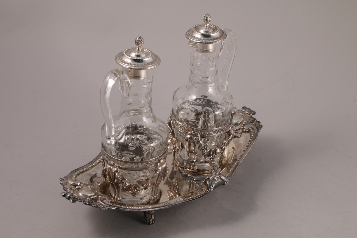 PARIS. HUILIER-VINAIGRIER de forme oblonge en argent. Le bassin à bords chantournés est orné aux éxtrémités d'un cartouche en cuirs découpés flanqués de feuilles de vignes et centré d'armes d'alliances timbrées d'un tortil de baron. Un rais de perle sur le pourtour. Les repose-bouchons adoptent la forme d'une couronne de lauriers. Piètement quadripode à attaches coquille agrémentées d'une grappe de raisin. Les porte-carafons reçoivent un décor ciselé et ajouré de guirlandes de pampres de vigne, consoles à enroulements et frise d'oves.