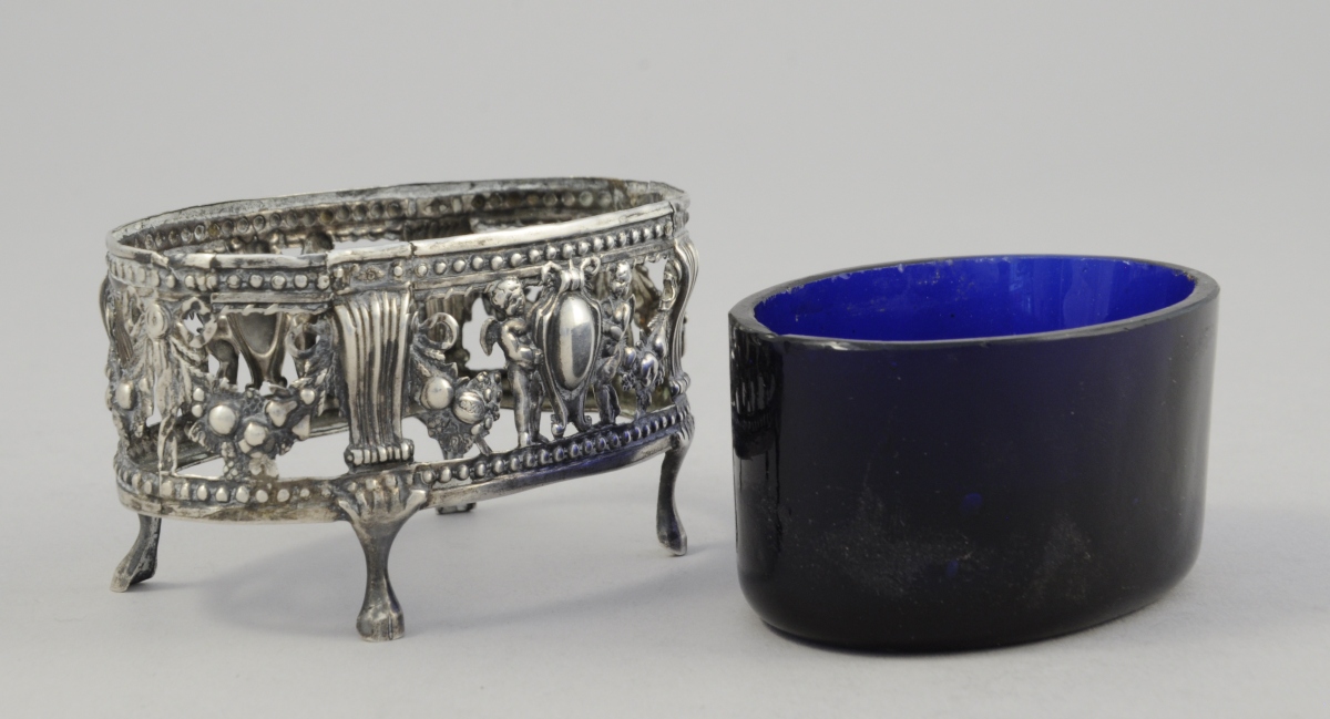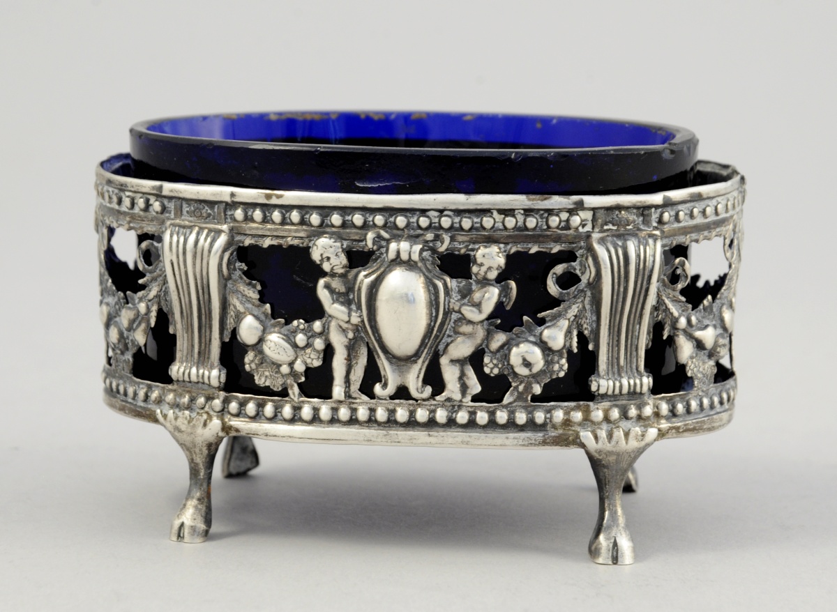 PARIS. Paire de SALERONS en argent de forme ovale à décors repoussé et ajouré de rais de perles, guirlandes de fruits, amours, médaillons et consoles cannelées. Ils reposent sur quatre pieds sabot galbés.