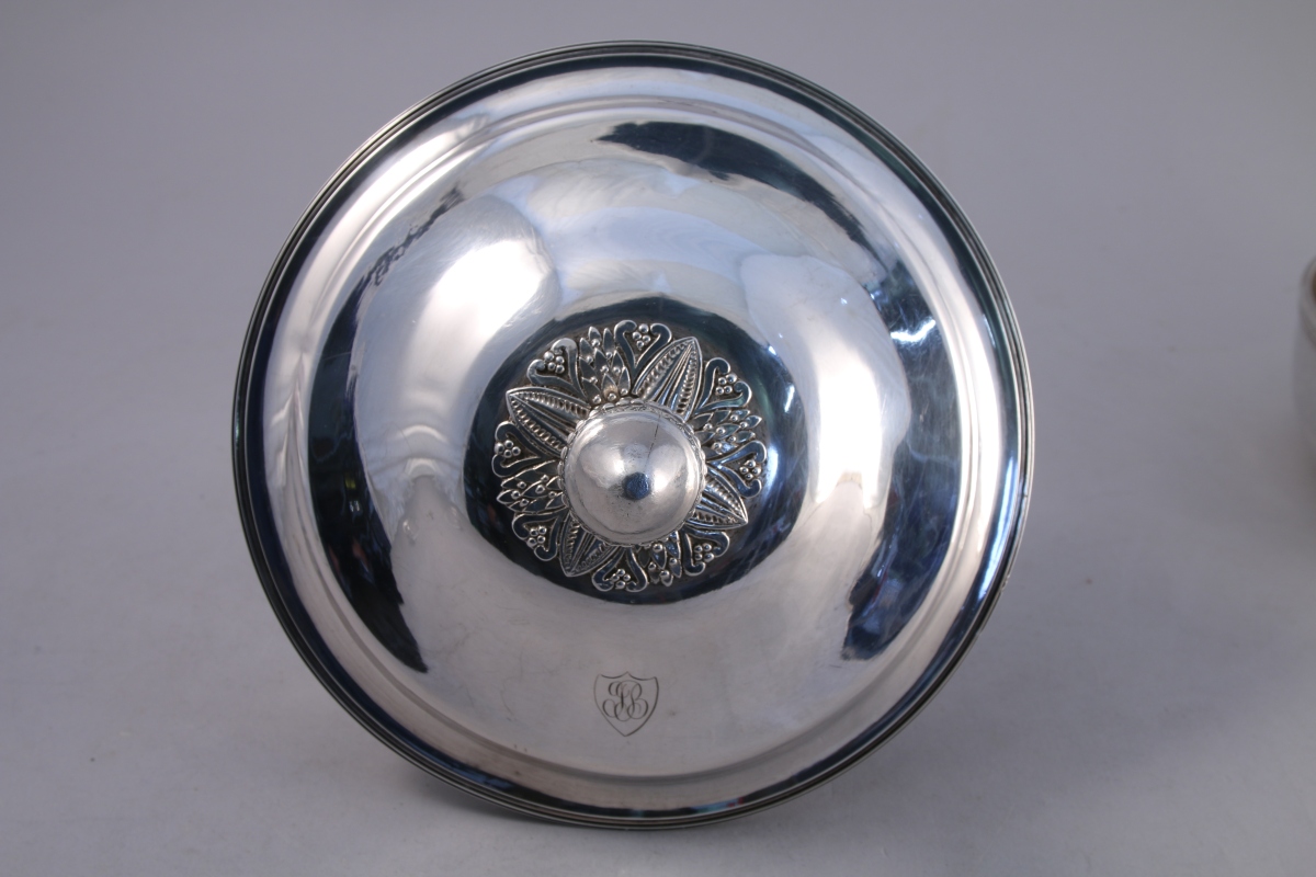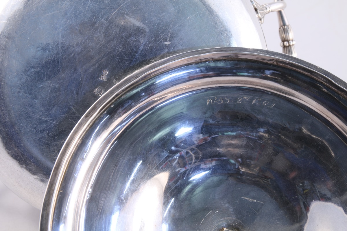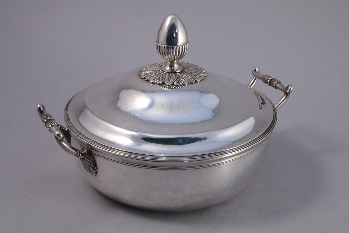 PARIS. LÉGUMIER COUVERT en argent de forme circulaire orné de filets sur les contours. Deux anses en bulbe de lotus affrontés. Couvercle marqué "n°53-2m-1°-6-9". Monogrammé "JB" dans un écu.